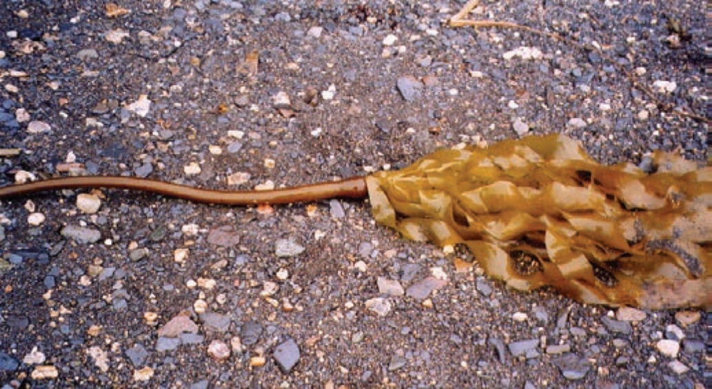 Bullwhip kelp (Nereocystis lutkeana), also called bull kelp, is a large seaweed belonging to the brown algae family. Growing in shallow bays or channels in depths of 30 feet or more, this impressive kelp can grow up to 100 feet in length. Bullwhip kelp is easily recognized by the long, hollow stem that terminates in a floating bulb on which long blades, 9 to 12 feet long, trail in the water. The stem, or stipe, is attached to the ocean bottom with a stout, rootlike holdfast. The bulb, the stipe and the blades are all edible.