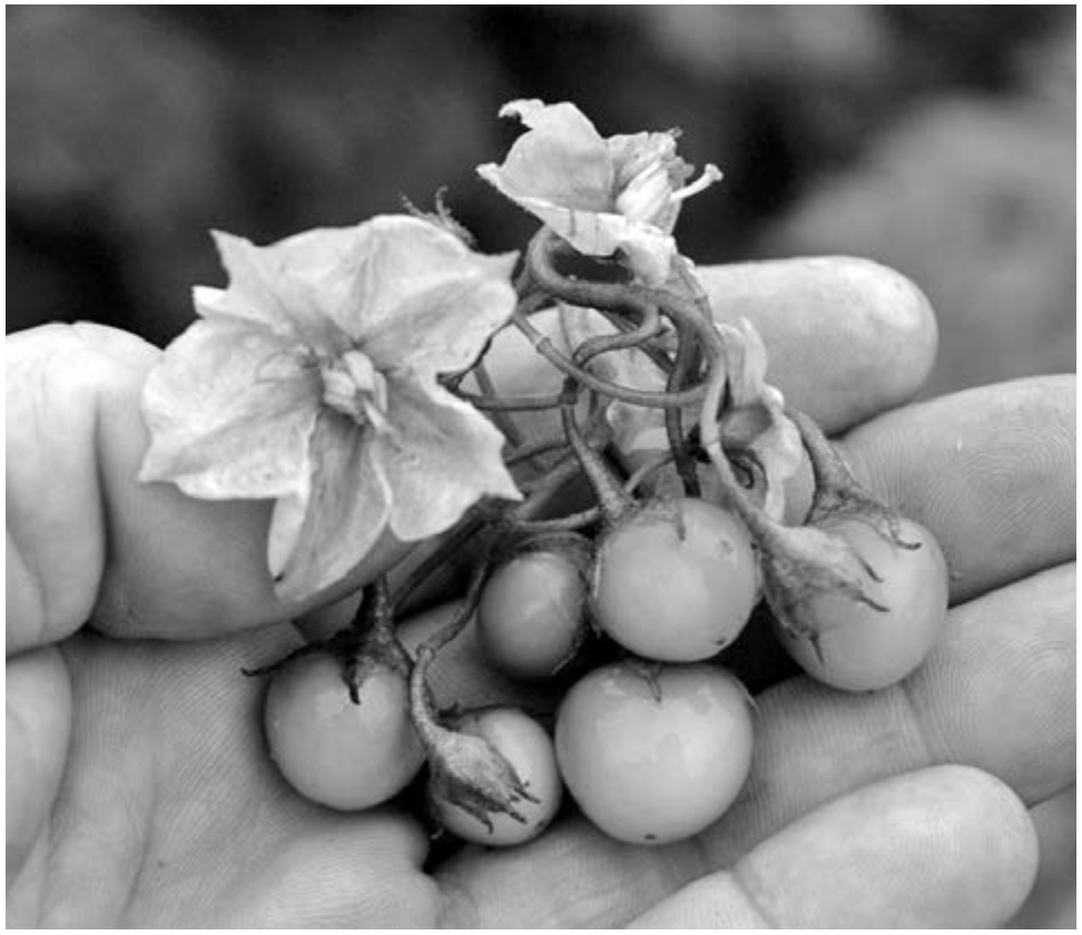 Once potato plants are flowering, the plants begin to pollinate each other. This results in small, round seed pods that look very similar to green cherry tomatoes. These pods contain true potato seeds, which can be planted to grow potato plants, but will not produce the same type of potato the seed came from, nor will the potatoes that are produced be the same as each other. Potato seed pods are poisonous to eat.
