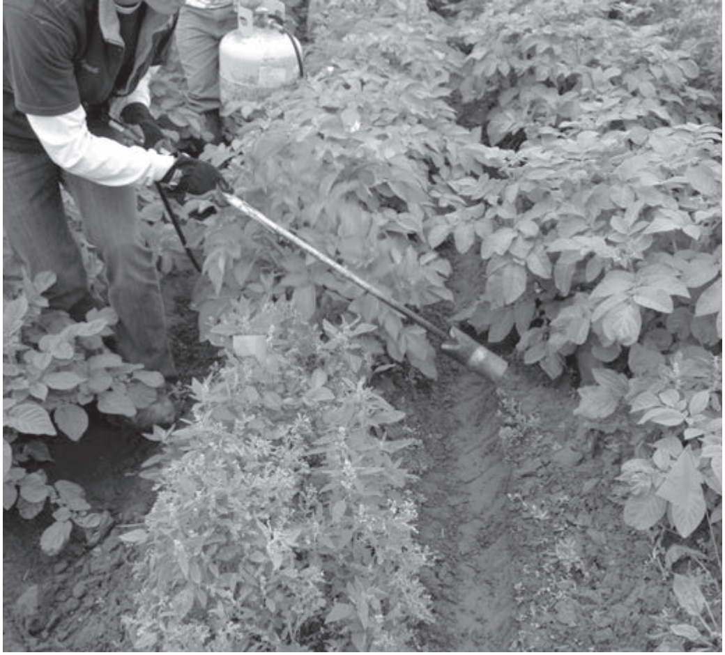 Flame weeding is very effective before the potato foliage has emerged. Even after the foliage has emerged, an aggressively growing potato crop can survive a light flame weeding. The foliage will be damaged where the flame contacts it, but the potatoes should grow replacement foliage within a week. This technique is very effective in controlling weeds within the potato row and on the sides of raised potato beds. For more information on the flame weeding technique, visit the National Sustainable Agriculture Information Service website at http://attra.ncat.org/attra-pub/flameweedveg.html.