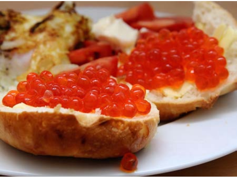 In rural Alaska communities, preserved salmon roe is often used as an addition to salmon soup. Salmon roe caviar can also be used in small quantities as a garnish for smoked fish canapés, seafood crepes or sushi and for pasta dishes, omelets or seafood salads. Salmon roe caviar may be enjoyed by itself on mild-flavored crackers or melba toast and is often served with sour cream, minced onion or lemon.