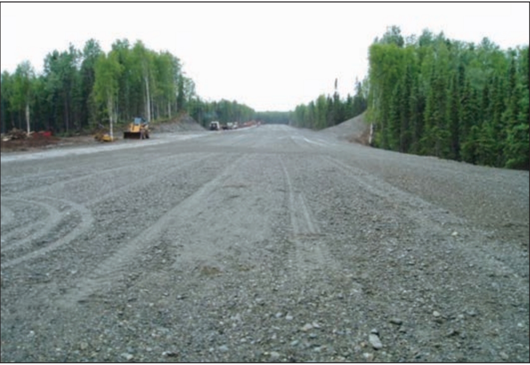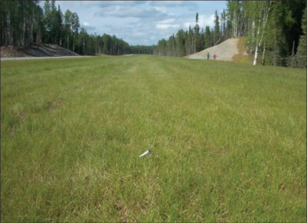 In August 2008, the University’s Cooperative Extension Service planted a 2,500-foot gravel runway near Talkeetna with Arctared red fescue grass to demonstrate the feasibility of grassing a gravel runway in Alaska. The crowned runway had been newly bulldozed and consisted entirely of gravel (see fig. 2). By June of 2009, there was almost no hint that a gravel runway lay beneath this beautiful stand of grass (see fig. 3).