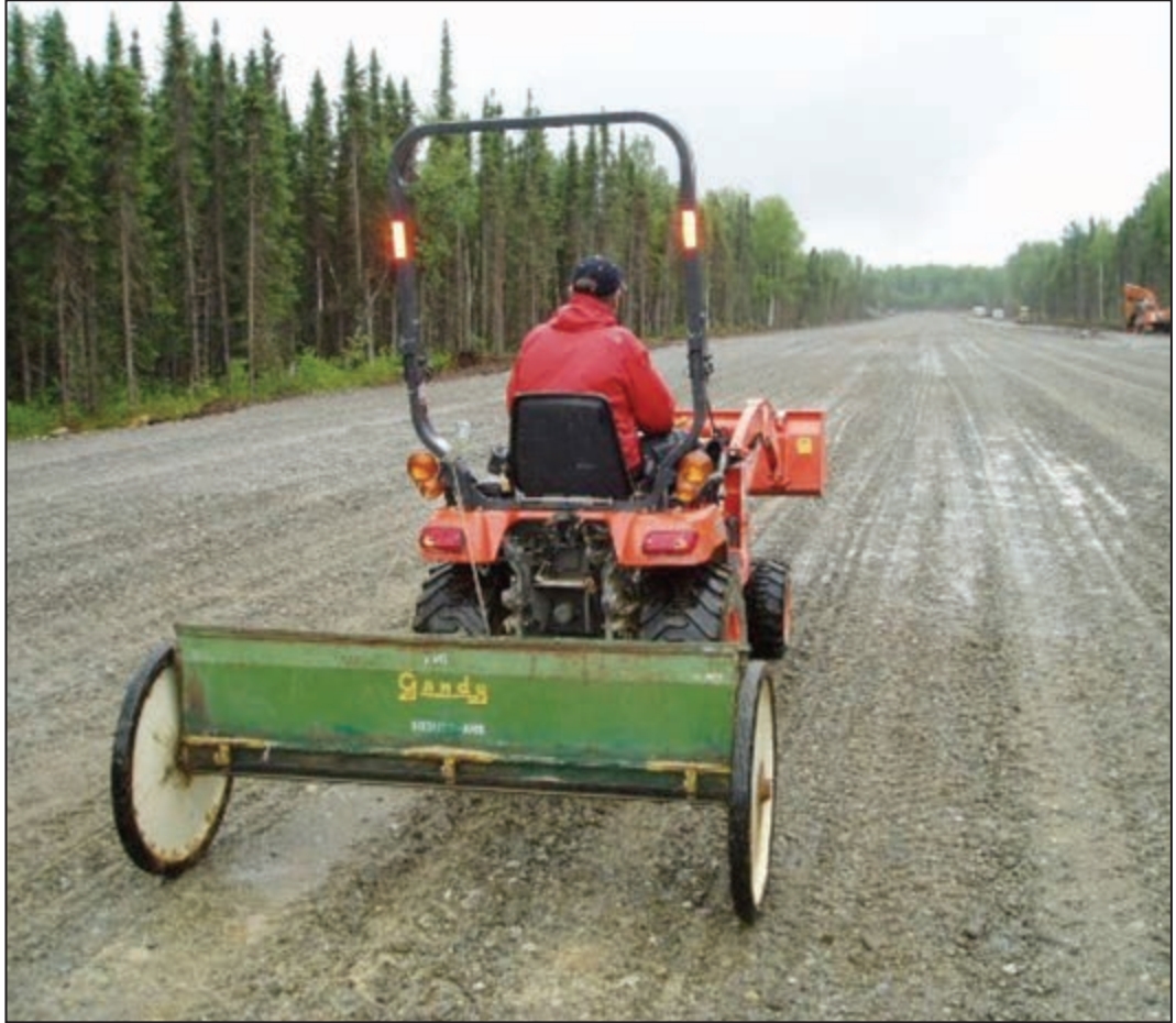 In the Talkeetna project, a small tractor and a dropseed spreader were used (see fig. 5). A broadcast spreader attached to an ATV works well, too. Purchasing a broadcast spreader for your ATV is probably a good idea because you will likely be applying fertilizer each year from now on. An unfortunate downside to growing grass in gravel is that it rapidly becomes devoid of nutrients and will require annual fertilization.