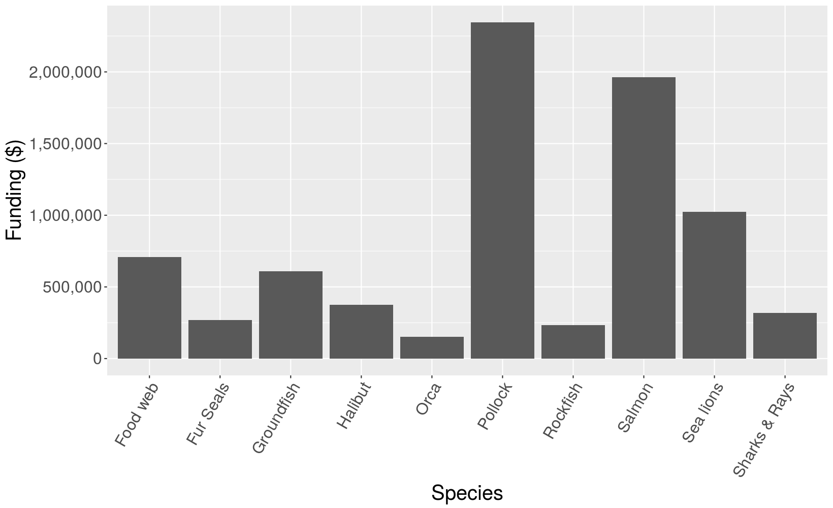 The PCCRC is by no means just about Pollock! While funding comes from the Pollock Conservation Coop, the research they fund is exceptionally diverse in terms of disciple, research theme, and focal species. Below you can see how the funds are allocated by discipline, research theme, or focal species.