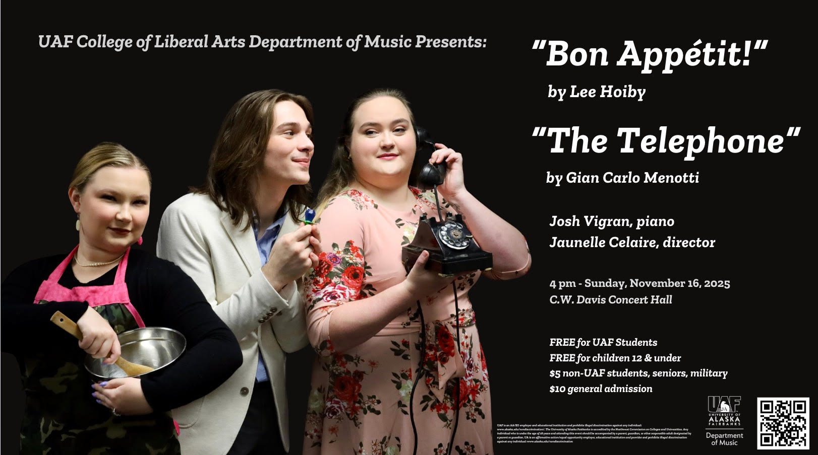 There’s only one chance to catch it: the UAF Opera Workshop presents a delightful double bill on Sunday, November 16 at 4 p.m. in the Davis Concert Hall. The evening features two one-act comic operas, Bon Appétit by Lee Hoiby and The Telephone by Gian Carlo Menotti, directed by Dr. Jaunelle Celaire and accompanied on piano by Joshua Vagran. Together, these short works promise a blend of humor, charm, and artistry.