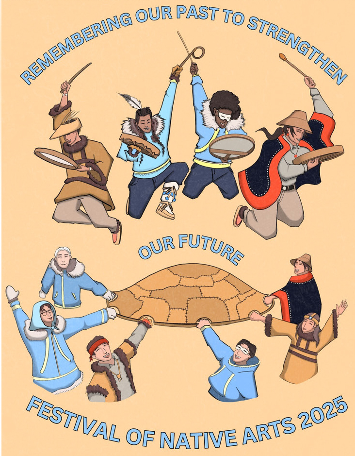 The logo for this year's Festival of Native Arts booklet represents the theme “Remembering our Past to Strengthen our Future” by showcasing a varied group of young Alaska Native dancers underneath what looks like the original Festival banner. The banner is displayed above the stage every year at FNA. To help us remember our past, stars are added to the banner on the cover art. By including these stars, we can honor our ancestors as well as all the dancers, songwriters, singers, drummers, and performers who were on the stage before us.