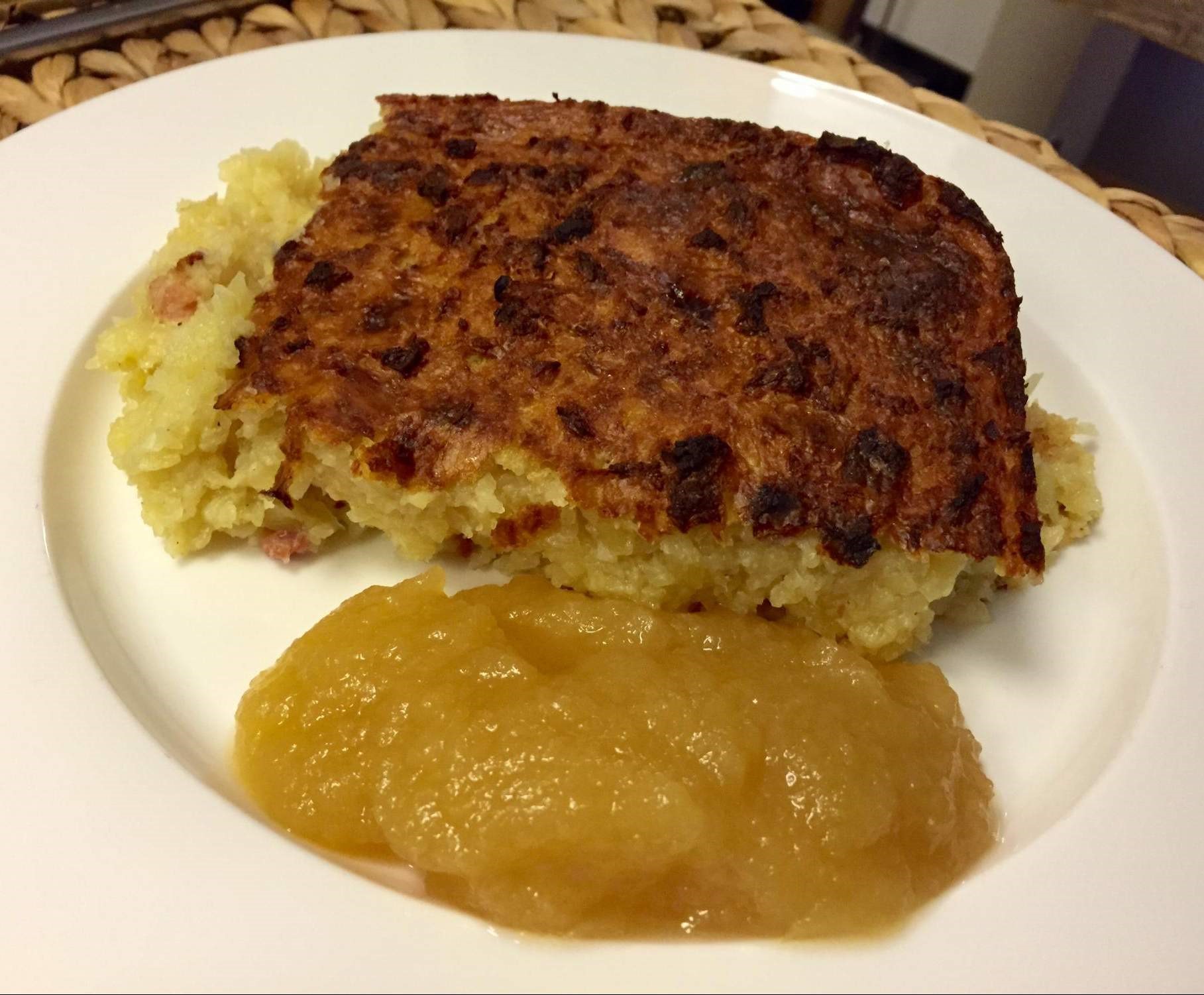 is made from grated potatoes baked in a pot with sausages (pepperoni or salami) and