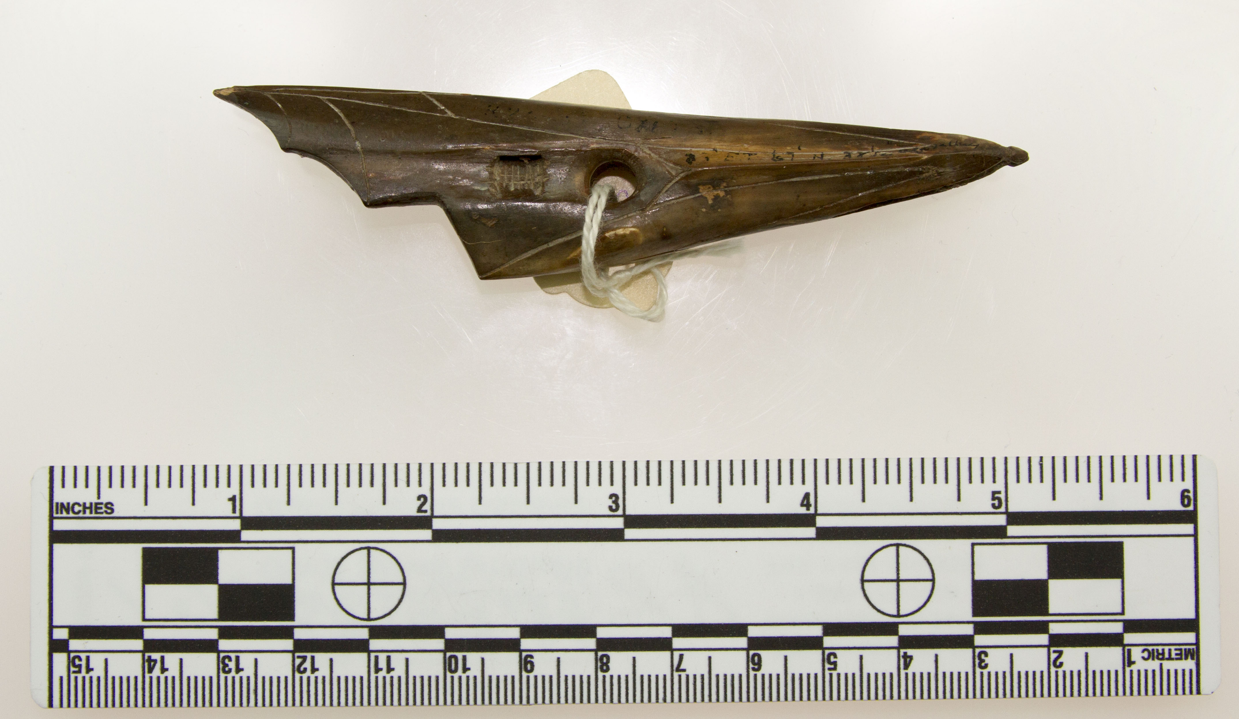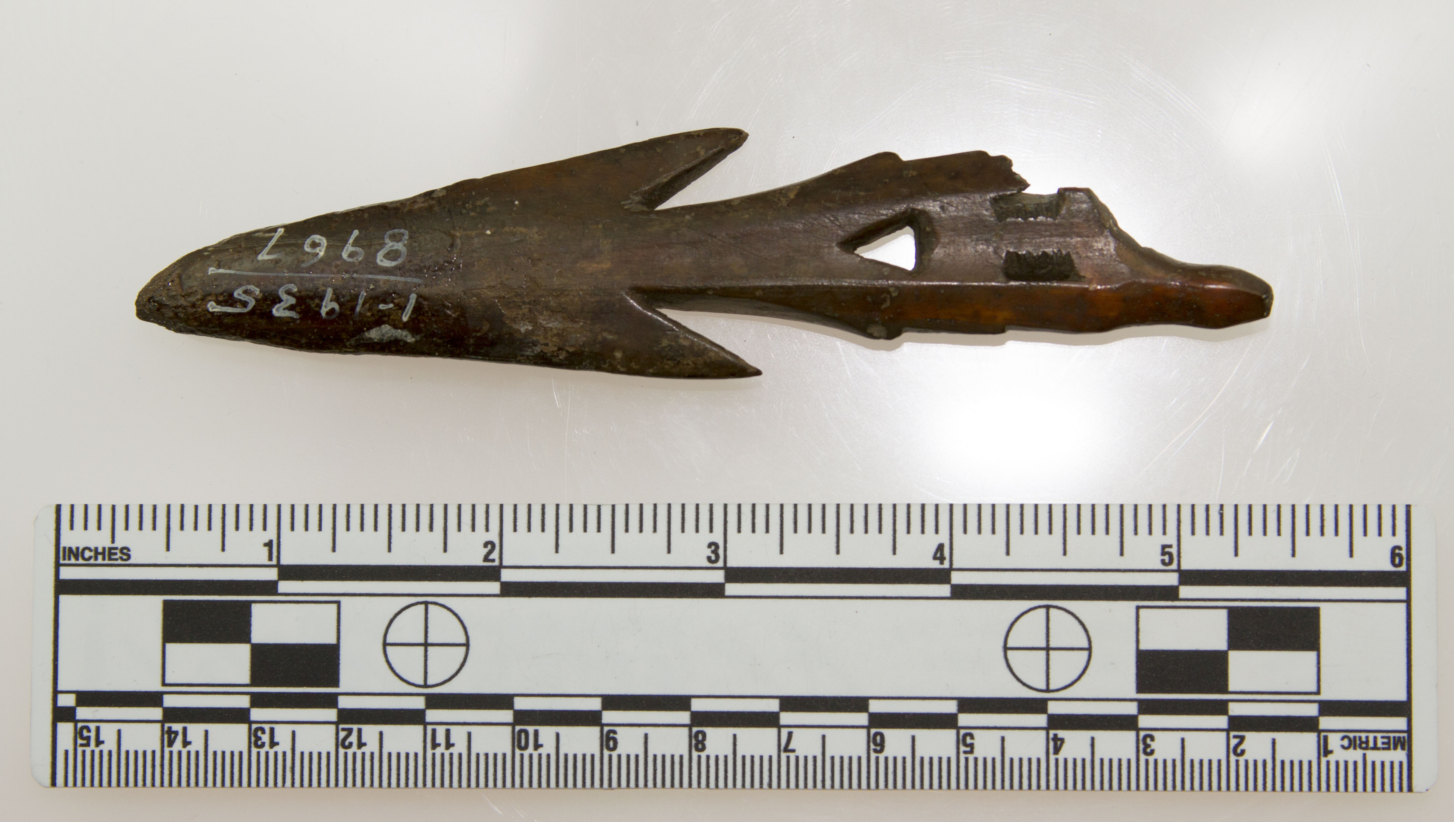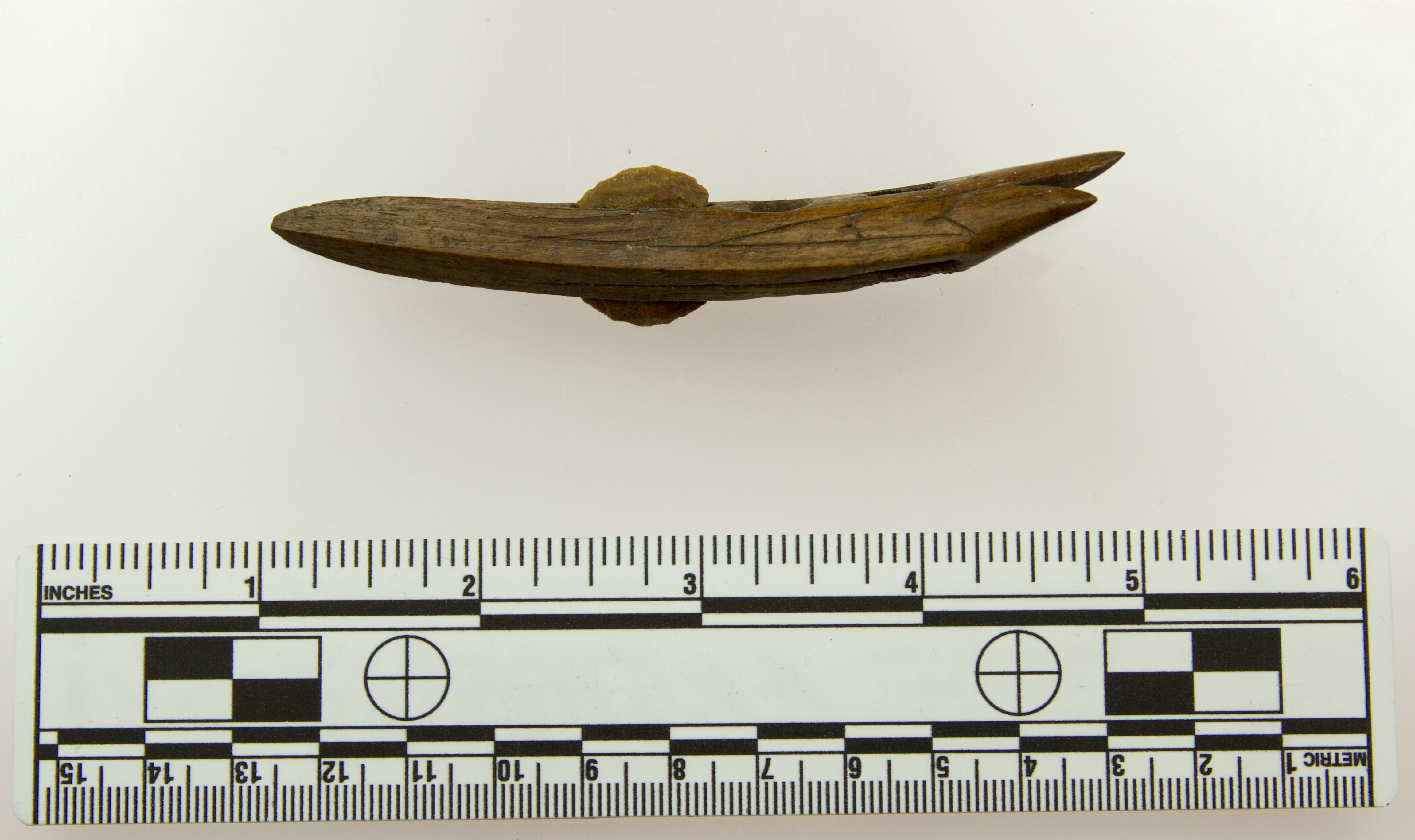 Figure 5: Old Bering Sea Type IIy harpoon head with Old Bering Sea Style 1 decoration (UA1-1935-8992). Designated as Old Bering Sea Type II because it has an asymmetrical trifurcated spur (one of which is broken), two lashing slots, a single drilled line hole, and two side blades at right angles (“y”). The decoration is Old Bering Sea Style 1 because of its simple, lightly incised lines (although it could be Punuk 1 Phase 1).