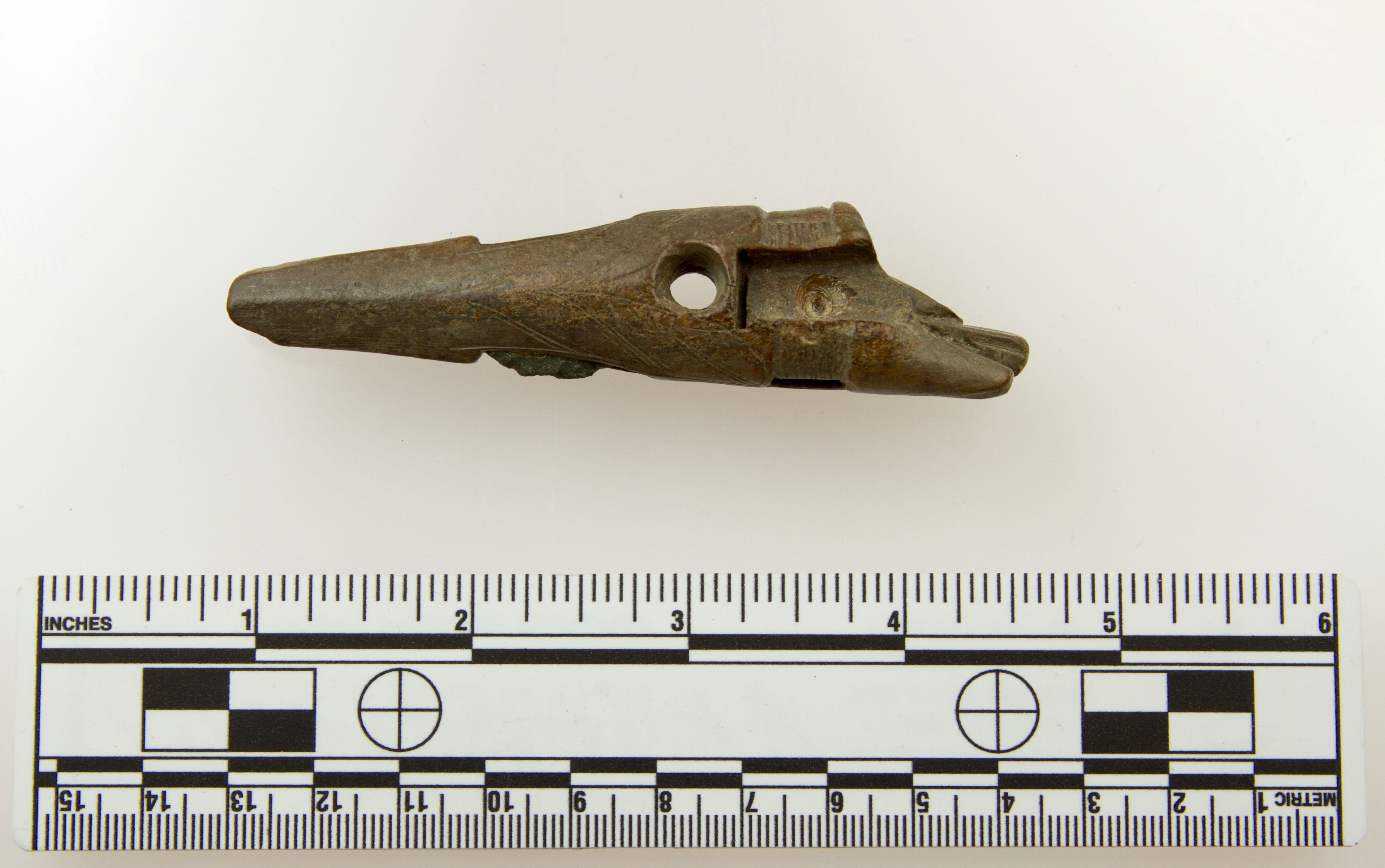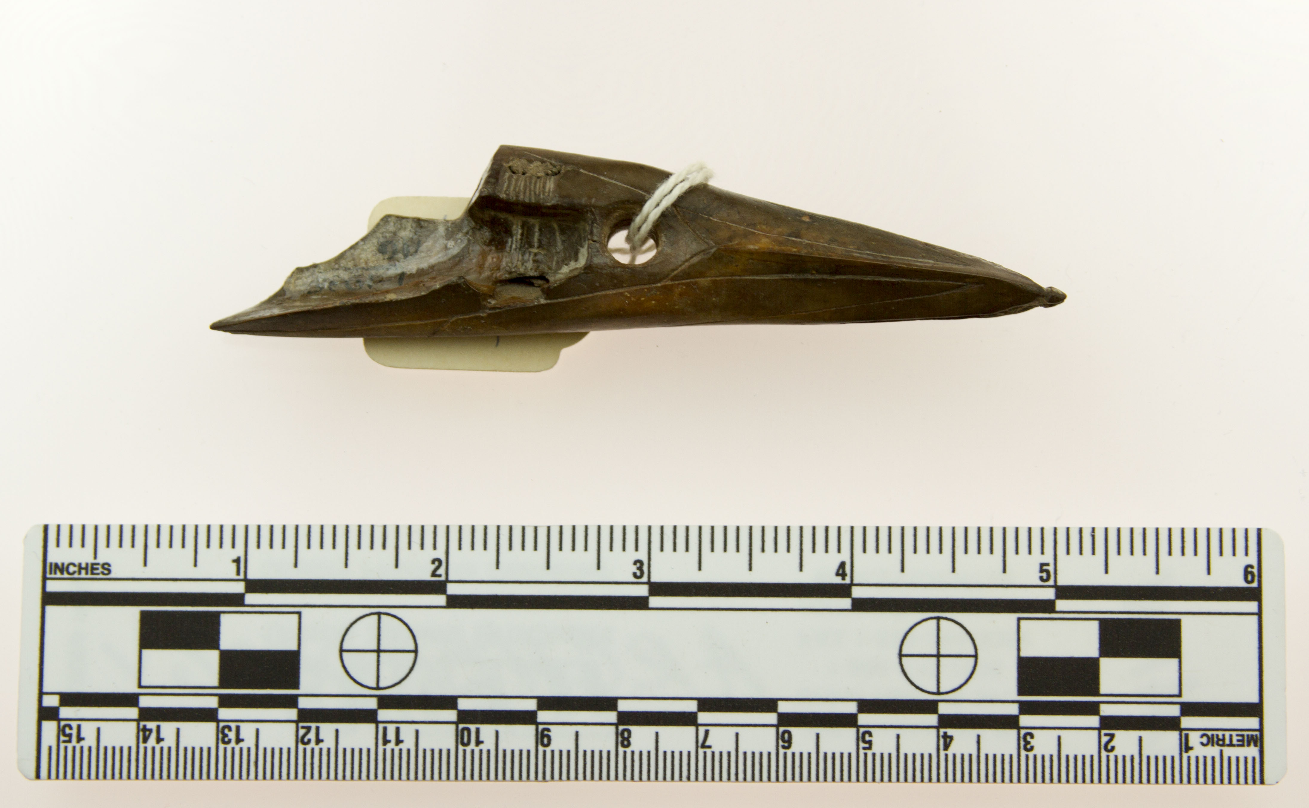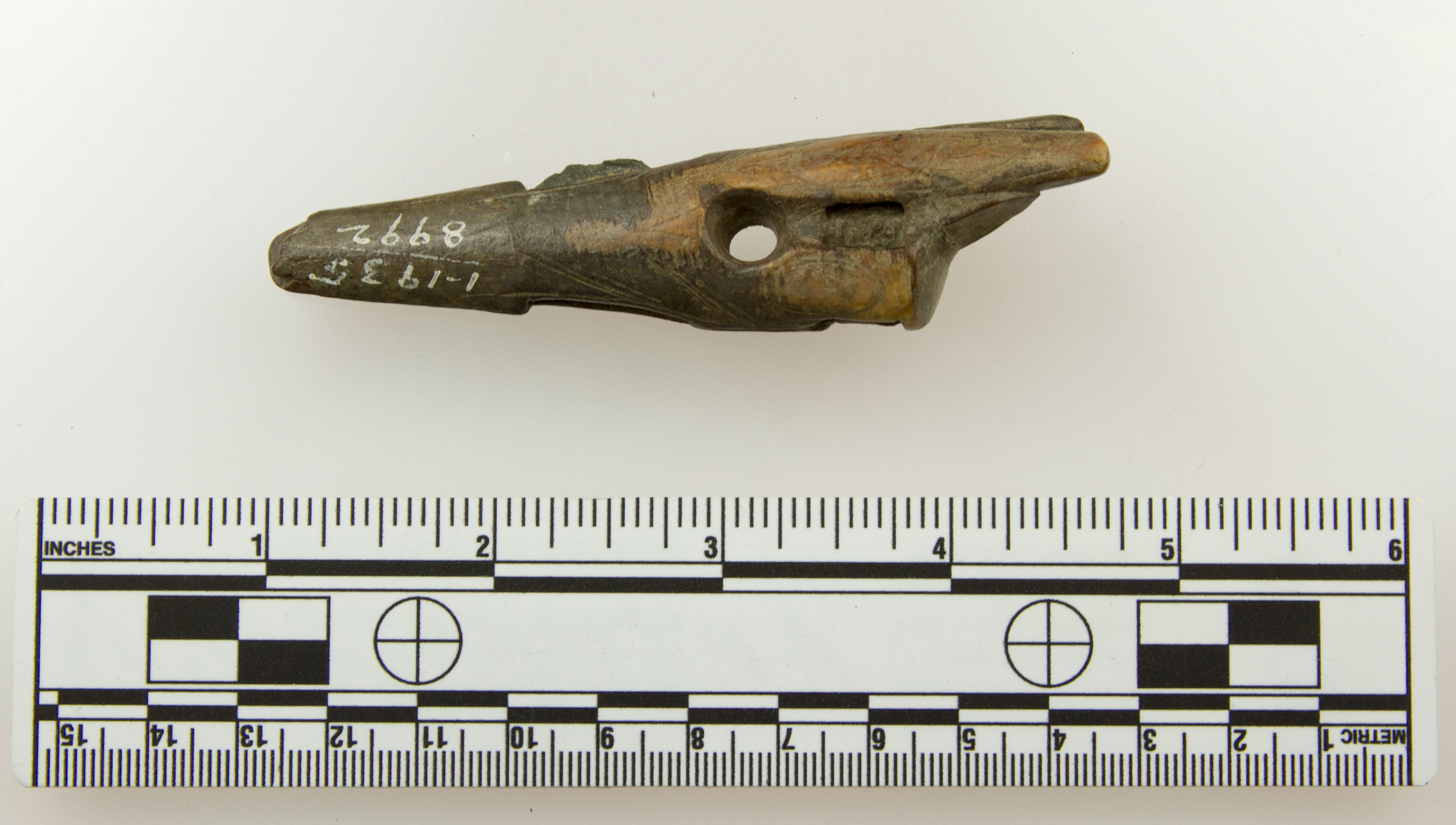 Figure 5: Old Bering Sea Type IIy harpoon head with Old Bering Sea Style 1 decoration (UA1-1935-8992). Designated as Old Bering Sea Type II because it has an asymmetrical trifurcated spur (one of which is broken), two lashing slots, a single drilled line hole, and two side blades at right angles (“y”). The decoration is Old Bering Sea Style 1 because of its simple, lightly incised lines (although it could be Punuk 1 Phase 1).