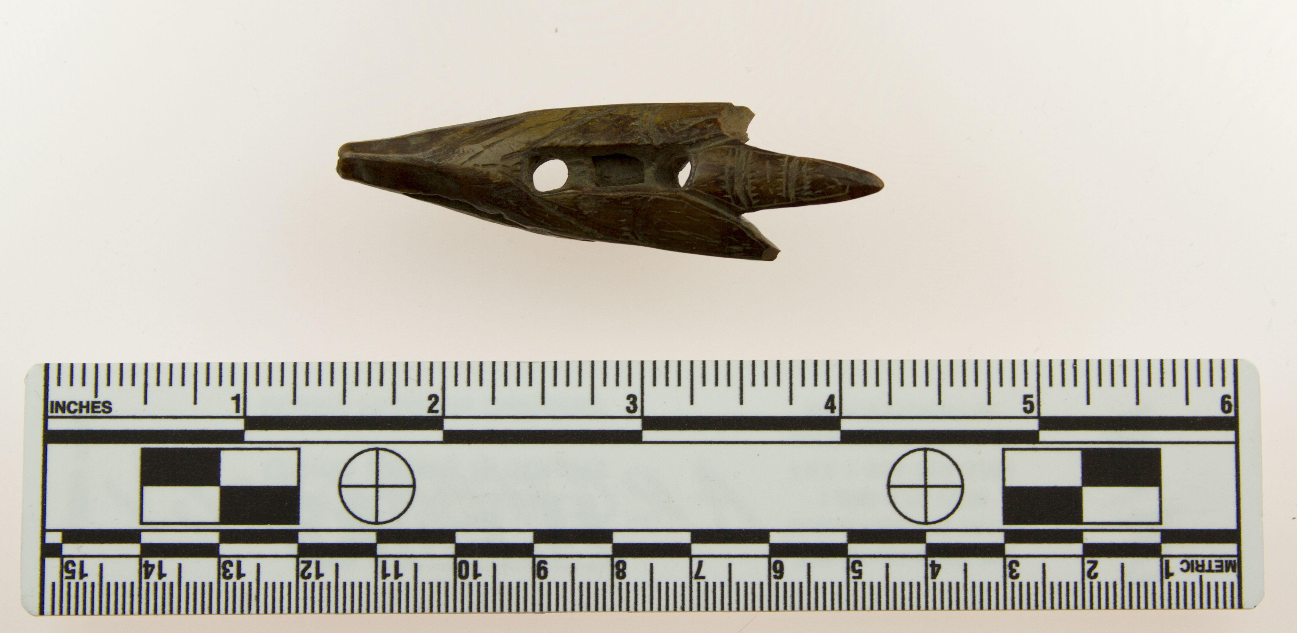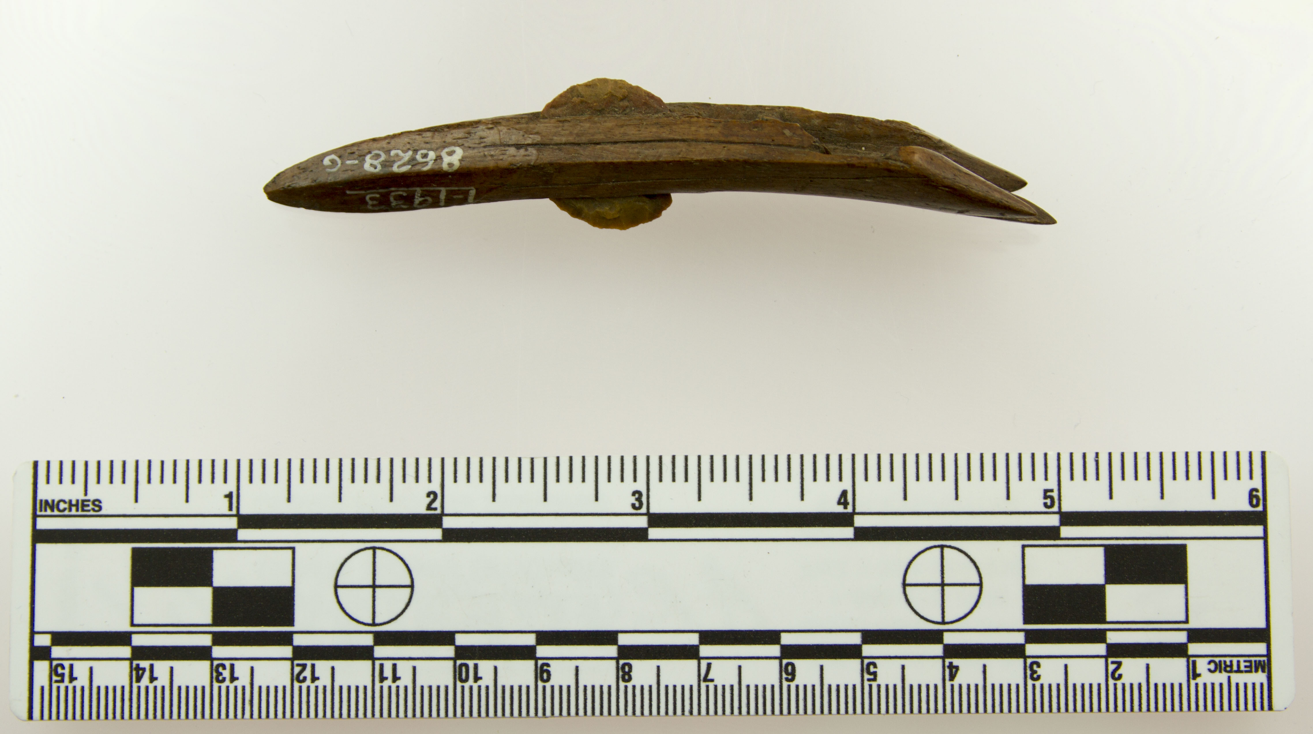 Figure 3: Old Bering Sea Type Iy harpoon head with Old Bering Sea style 1 decoration (UA1-1934-1596). Classified as Old Bering Sea Type I because it has a trifurcated spur (one of which has broken off), two lashing slots, two drilled line holes, and the holes for two side blades coming out at a right angle. This orientation of the side blades is what gives the type the “y” categorization. It was given the style Old Bering Sea 1 because of its simple, lightly incised lines, with minor converging lines.