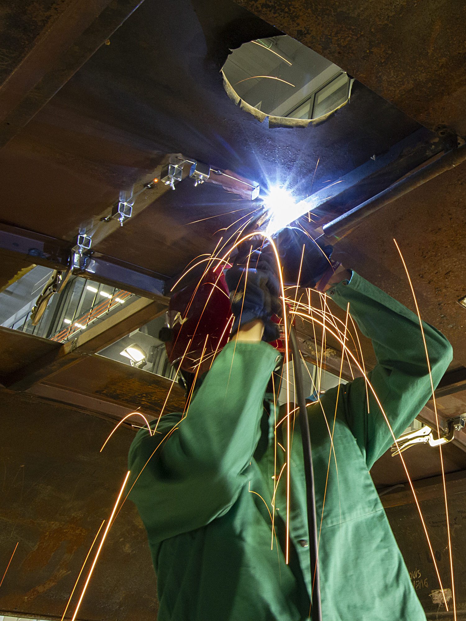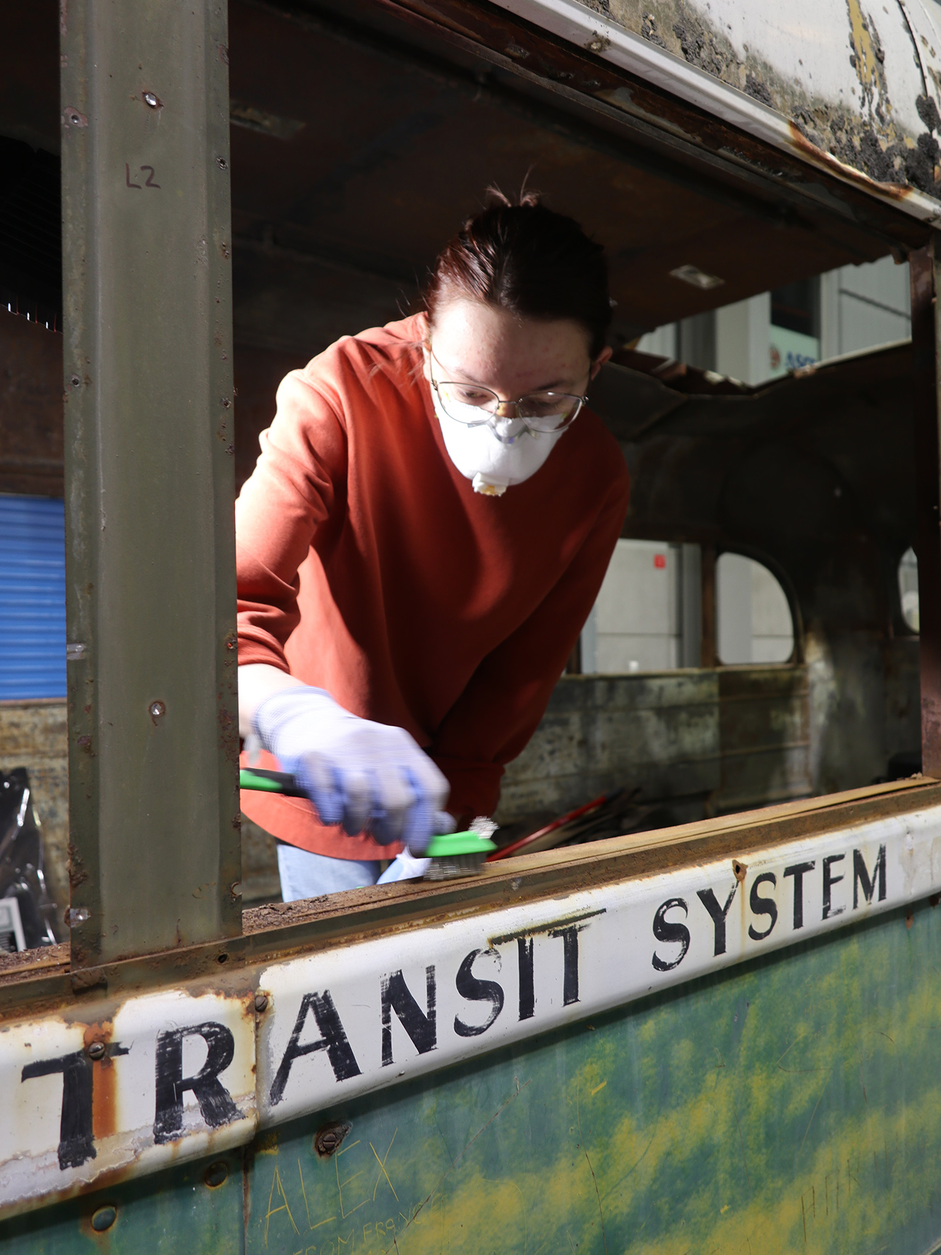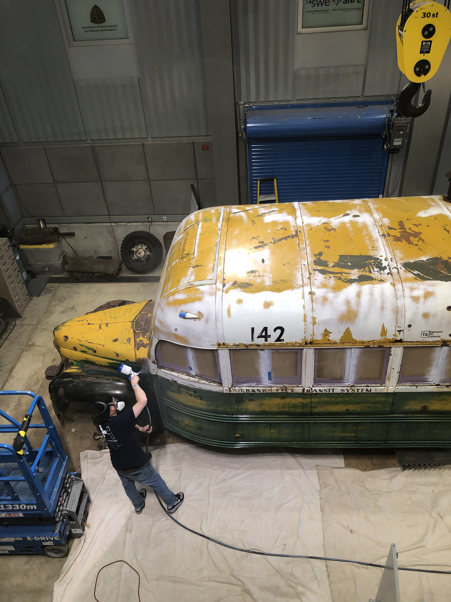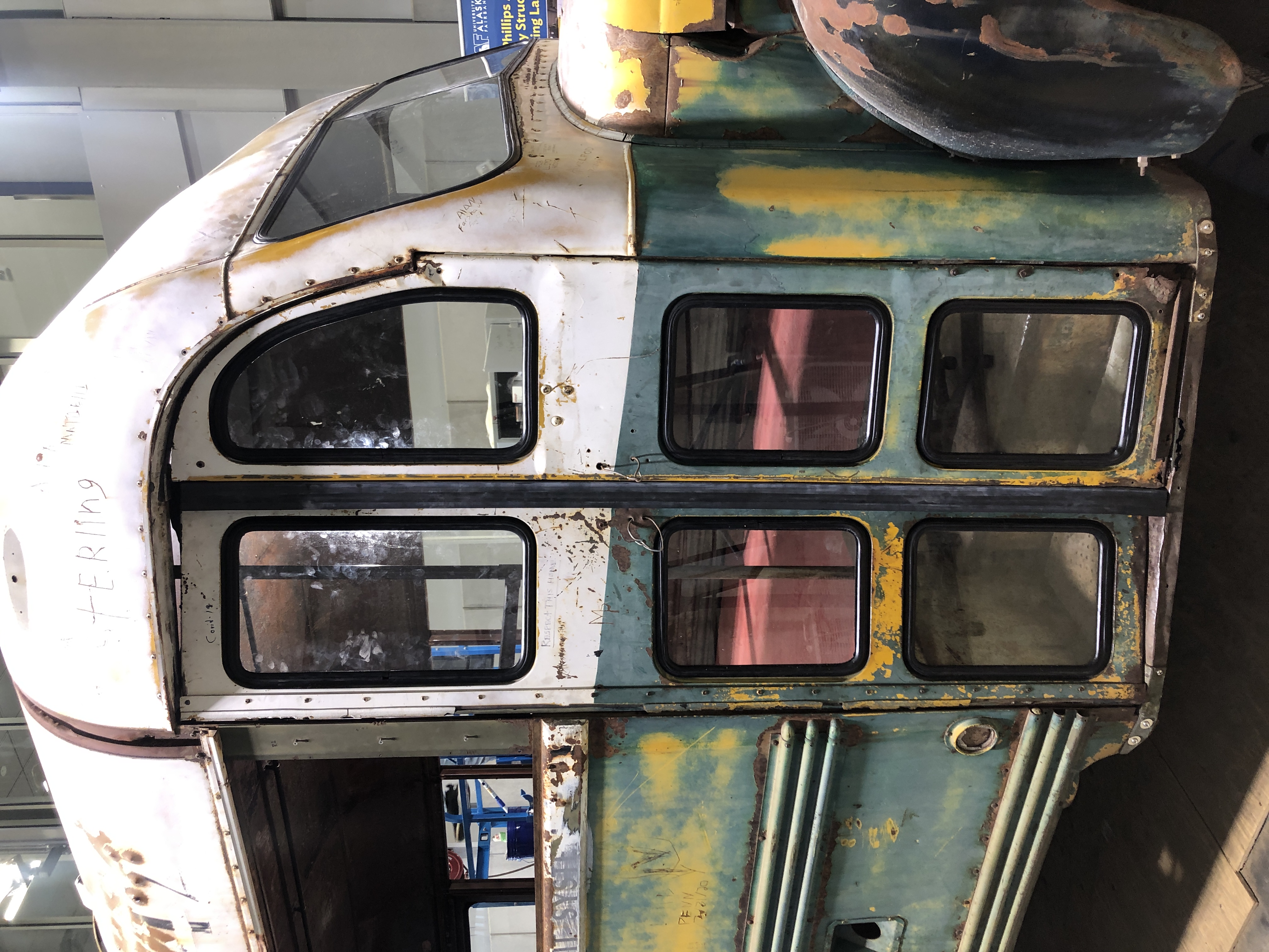 Conservation of Bus 142 took place in the Joseph E. Usibelli Engineering Learning and Innovation Building in the ConocoPhillips Alaska High Bay Structural Testing Lab from January-April 2023, and was viewable by the public from windows on the 2nd and 3rd floors of the building through September 2023.
