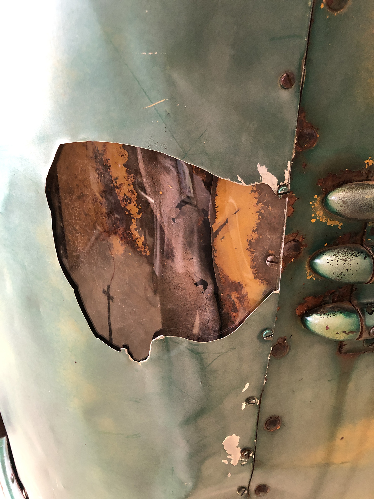Bus 142 had many holes from gunshots, rust, and vandalism. These holes allowed agents of deterioration, such as precipitation and pests, to increase the speed at which the bus was deteriorating. To slow this process, the conservators sealed all holes using a variety of methods. These included applying a plexiglass cover, spray foam, metal, fiberglass, and caulk, as appropriate. |