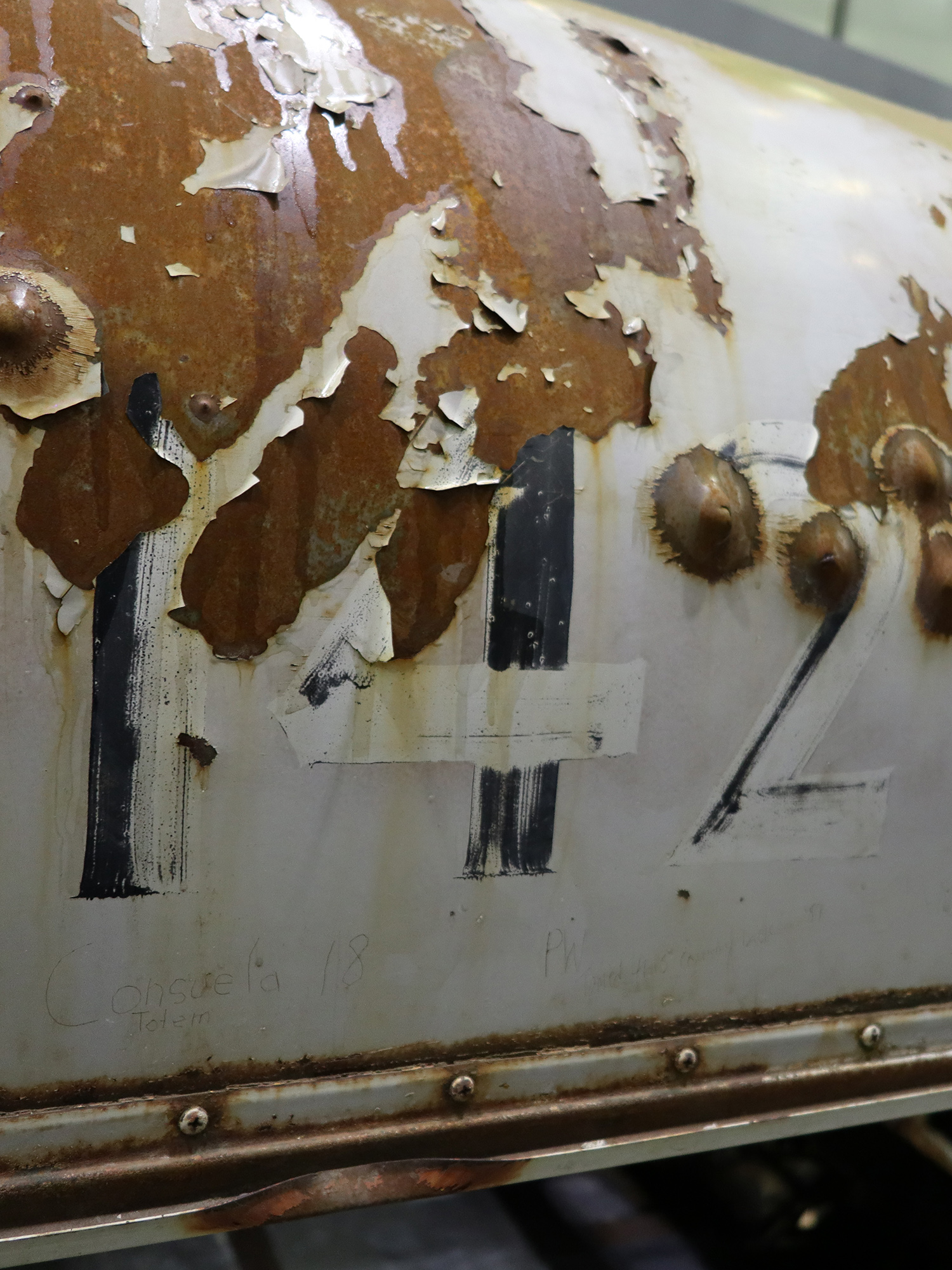 Bullet holes were softened by slightly filing, flattening, or deburring the edges. Some infilling and covering helped to match adjacent surfaces and prevent continued damage from precipitation and pests. This was especially important for the iconic “142” area stenciled above the driver side window, which was heavily damaged by bullet holes.