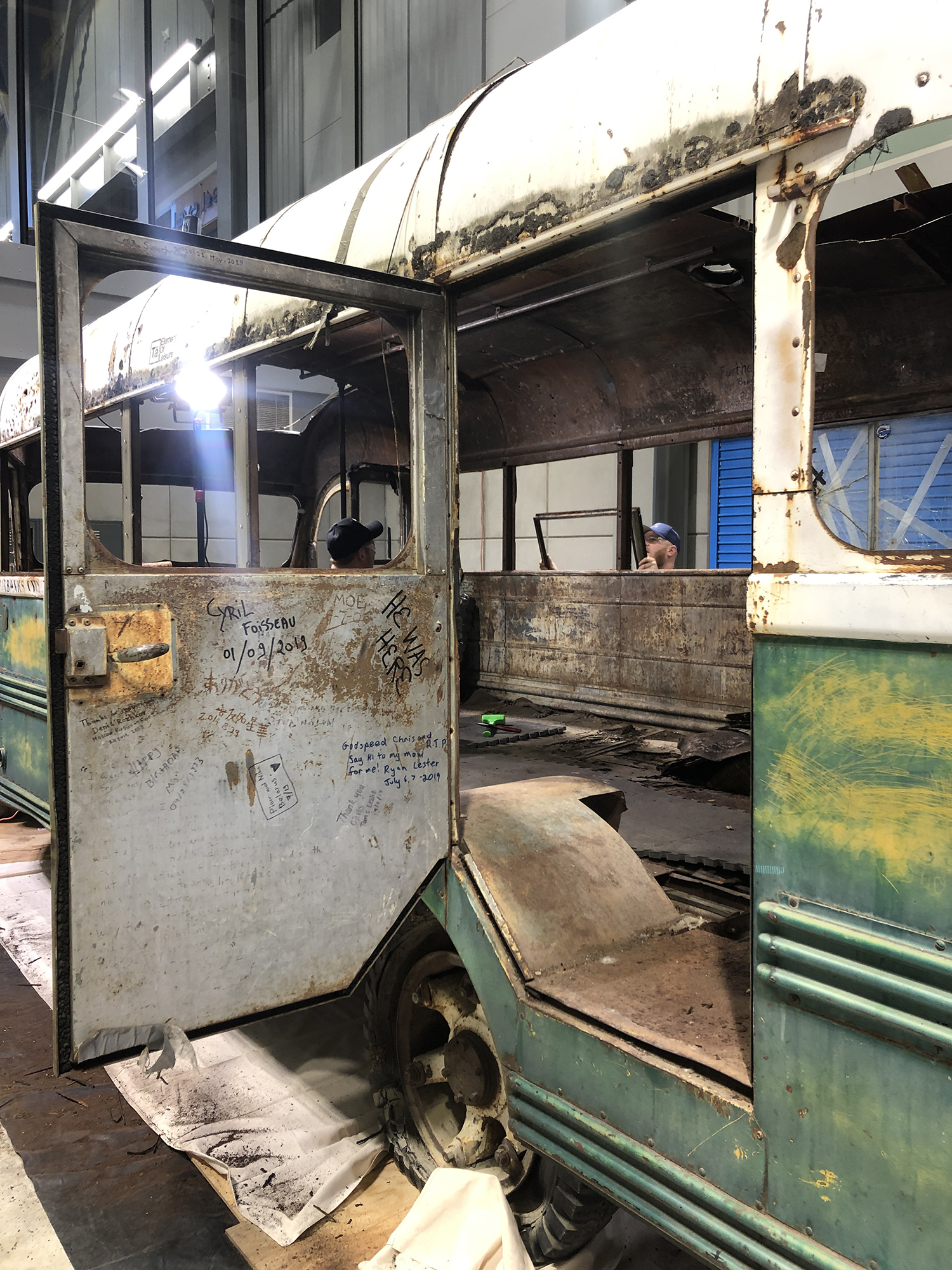 The passenger side doors were severely damaged from use and prior attempted repairs to the mechanism, in addition to missing and broken glass and rust. After the donated glass from Frontier Glass was installed, the conservators repaired the hinges so the doors can fully open and close, sealing the bus from further precipitation and pest damage. |