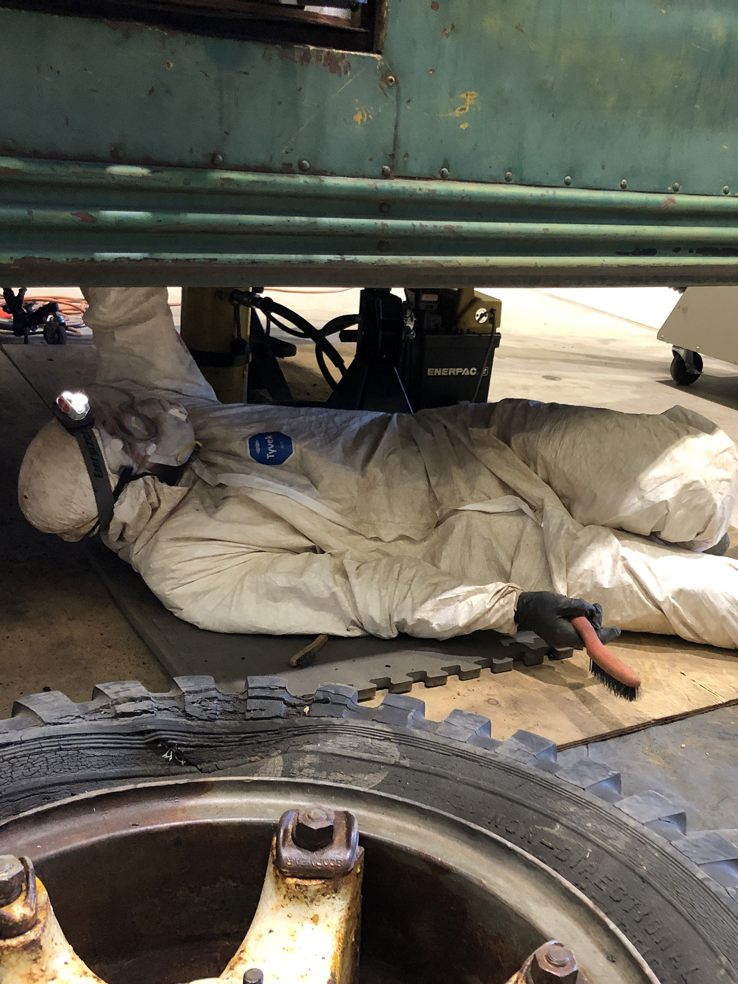 The bus undercarriage was heavily coated in dirt from the Stampede Trail. Conservators from B.R. Howard spent days scrubbing the undercarriage clean in order to apply a protective coating to slow further rusting of the base structure. |