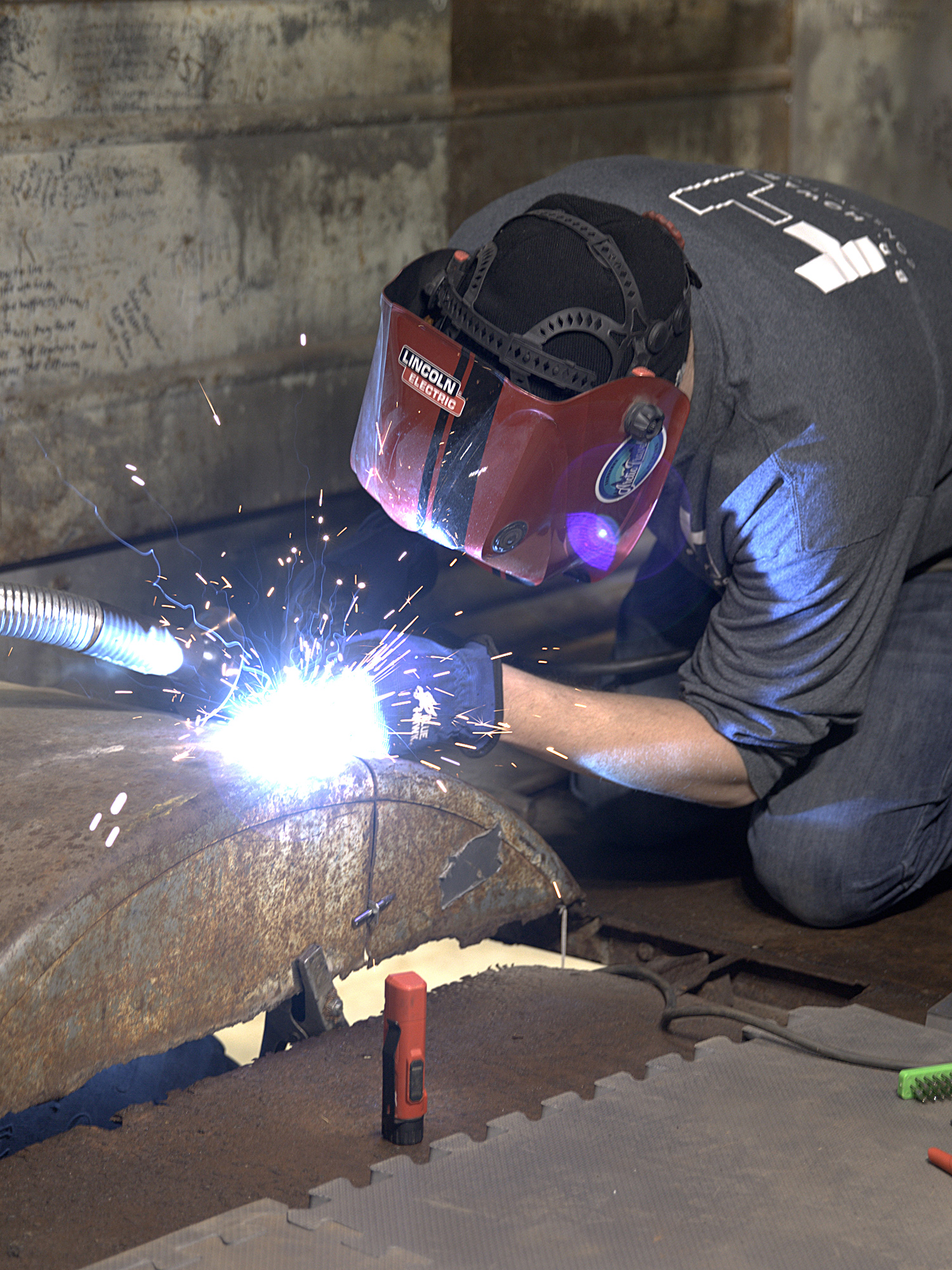 Inside the bus, layers of flooring were deteriorated beyond repair. Holes cut through the floor and roof to accommodate the removal of the bus from the Stampede Trail by the Army Air National Guard required welding to re-install those elements.