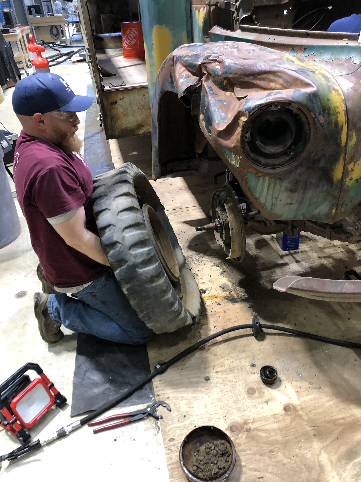 The bus wheels are an essential storytelling component for the eventual exhibit. The reason the bus was left on the Stampede Trail was because the front driver side wheel broke away from the hub, preventing the bus from being easily towed back to Fairbanks. After lifting the bus onto jack stands, conservators from B.R. Howard removed the wheels in order to clean the packed dirt from around and inside the hubs. They then applied a protective coating to the metal and painted surfaces. |