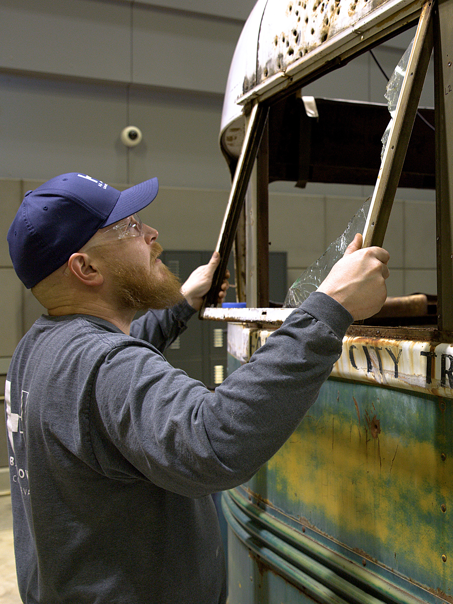 The majority of the windows were either broken out or severely cracked prior to arriving at UAMN. The window frames were taken out, each requiring the removal of 12 screws. The glass was replaced into the original frames through a generous donation from Frontier Glass. This encloses and protects the bus interior from further deterioration. |