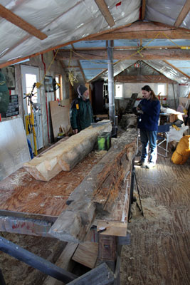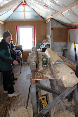 Sandy Jamieson, at his studio, and PI Angela Linn, discuss the progress on the replication of rotten timbers. Jamieson used locally-harvested white spruce to replace sections of the blockhouse that were structurally unstable.