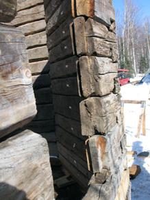 Jamieson and his preservation team replaced a number of logs that were too badly deteriorated and took advantage of a beautiful series of days in mid-April to test-fit their work. This photo shows the tenons at the ends of the logs around the door opening.