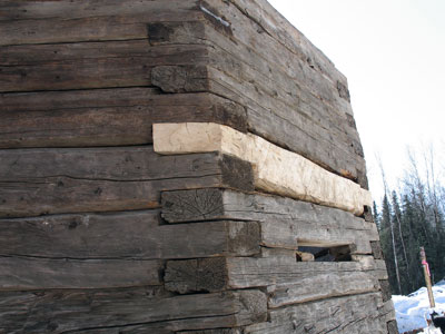 One example of the replacement logs crafted by Jamieson and his team. Locally-harvested white spruce peeled logs were scribe fit to perfectly match the logs above and below.