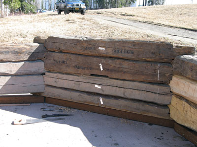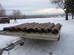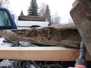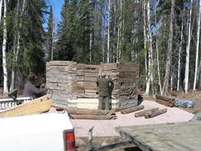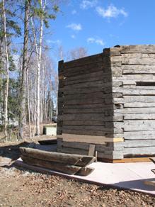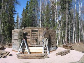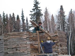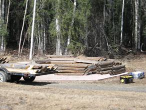 The scribed chinkless logs with tenon-end self-locking notches are stacked onto a trailer for transport to the log preservation specialist's workshop. Over the winter of 2010-11, the preservation team will consult to determine the best course of action for stabilizing the structure while retaining as much of the original building as possible.