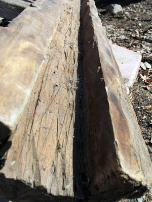 One log shows the evidence of insect damage, likely the powder post beetle infestation that occurred in 1984. The log preservation specialists will examine each log to determine the structural stability, and in consultation with Museum staff, determine whether to replace the log or stabilize it.