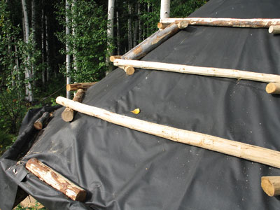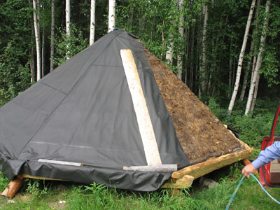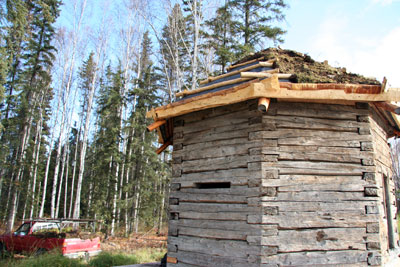 Sandy Jamieson and his assistants worked during the beautiful months of August and September to rehabilitate the spruce pole roof, by getting off the last remnants of polyethylene sheeting, by adding layers of natural canvas, modern landscaping fabric (historically the builders would have used birch bark), constructing "sod stops" of peeled tamarack poles, and finally, locally-harvested tundra sod (complete with blueberries, labrador tea, and all manner of tundra flora).