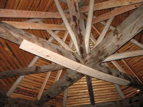 The internal roof support structure was blocked with dimensional lumber to hold it in place while the roof was lifted off the house in one piece. Note the difference between the original spruce horizontal spokes and the re-created spruce pole roof and rafters.