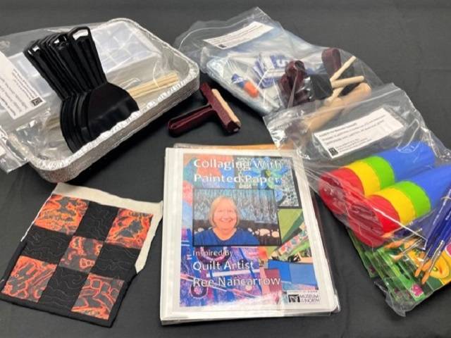This kit gives students a chance to create their own painted paper “fabrics” to cut and collage into a paper “quilt”. They will become familiar with Alaskan quilt artist, Ree Nancarrow, learn about how she develops her fiber creations, and explore abstract and realistic quilt designs. Collaging and quilting share similar techniques of piecing together materials to create an image or design.