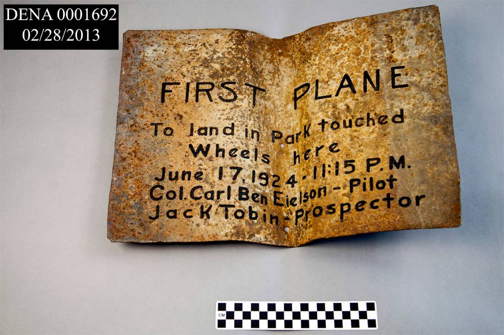 Sign made of heavy sheet metal. There are three holes lined up vertically in the middle of the sign, for attaching to a post. Printed in black paint are the words: “FIRST PLANE to land in Park touched Wheels here June 17, 1924 - 11:15 P.M. Col. Carl Ben Eielson - Pilot Jack Tobin - Prospector". Metal is corroded. The date of manufacture is unknown.