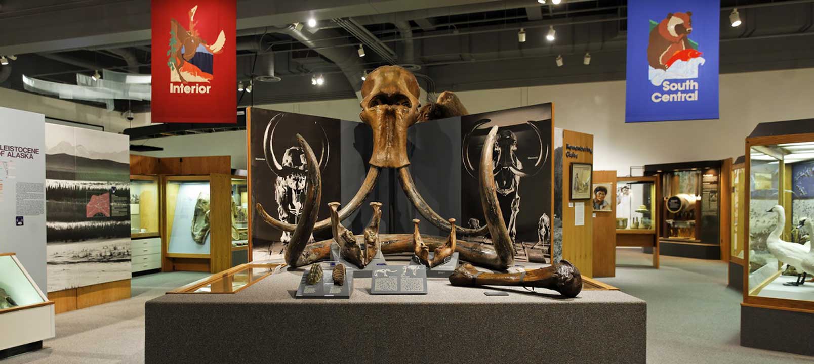 The large woolly mammoth skull and tusks at the entrance to the Interior Gallery are a testament to the size of the 31 species of Pleistocene mammals that roamed the ancient grasslands. Thanks to the continuing presence of permafrost, many of these fossils were recovered when miners on the lookout for gold washed away the frozen silt preserving the plant and animal remains for thousands of years.