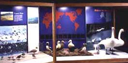 The Birds of the Wetlands exhibit highlights the Copper River Delta, an important resting and feeding area for several million migratory shorebirds and waterfowl. Eiders, geese, swans, jaegers, and dunlins are some of the birds depicted in this environmental diorama.
