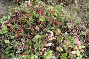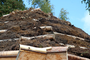 In August 2012, builder Sandy Jamieson began to fill in the gaps of the sod that had shrunk since its original construction. He hopes this dogwood plant-filled moss will take root on our blockhouse roof and provide a colorful palette year-round.