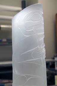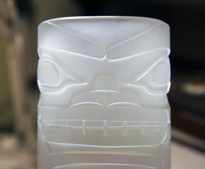 His unique interpretations of Tlingit legends are visible in his stunning glass sculptures; many take the traditional forms of crest hats, masks and rattles. He employs a complex combination of techniques, including glassblowing, sand carving and inlaying.