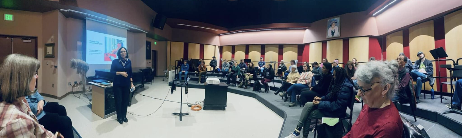 When Dr. Senungetuk visited last March, she presented two lectures - a morning lecture to the newly redesigned Alaska Native Music (ANM) course and an evening lecture to the Fairbanks community in the Davis concert hall. In her morning lecture, Dr. Senungetuk spoke to ANM about her own work as a violinist and an ethnomusicologist, touching on the ways in which her performative and ethnomusicological efforts have both converged and diverged throughout her career. We opened up this particular class to the community, which sparked thoughtful discussion between students ingesting this material for the first time, and community members, some of whom knew very well the topics and experiences that Dr. Senungetuk presented on. Her evening lecture in the Davis concert hall surveyed music and dance practices spanning the entire circumpolar region of the world. In Alaska, Dr. Senungetuk featured the Kingikmiut Singers and Dancers of Anchorage. In Canada, she surveyed the Ulukhaktok Western Drummers and Dancers as well as Inuit drum dancing and Katajjaq (throat singing) at the Gjoa Haven Dance Festival. In Tasiilaq, Greenland, a traditional Inuit drum dance revealed a much more intimate approach to drumming and dancing compared to the groups of Alaska. From there, Dr. Senungetuk showed a video of a Sami drummer in Kjøllefjord, Norway. At first, the drummer scraped the frame of the drum with his mallet, creating a sustained wooden effect. This was followed by an incredibly warm, reverberant tone of the drum which accompanied his yoik singing. As Dr. Senungetuk described, “Yoik, as I understand, is a form of an honorific - a way of honoring someone, or perhaps something… or maybe a way of maintaining a connection with an ancestor of the past by keeping the memory of the person alive in the present moment.” In Russia, the audience learned about the Solnyshko Dancers from Novoye Chaplino, where females assumed the drumming responsibility, playing similarly to the Iñupiaq style, that is, hitting the drum from the back with a slender stick. These examples illustrate some of the groups and practices that comprise ongoing Indigenous circumpolar music practices in Dr. Senungetuk’s presentation. And while each example showcased subtle similarities and differences, it was clear to Dr. Senungetuk that despite the geographical spread of the circumpolar, Indigenous peoples of the circumpolar arctic regions have a similar view of the world; a view from the North.