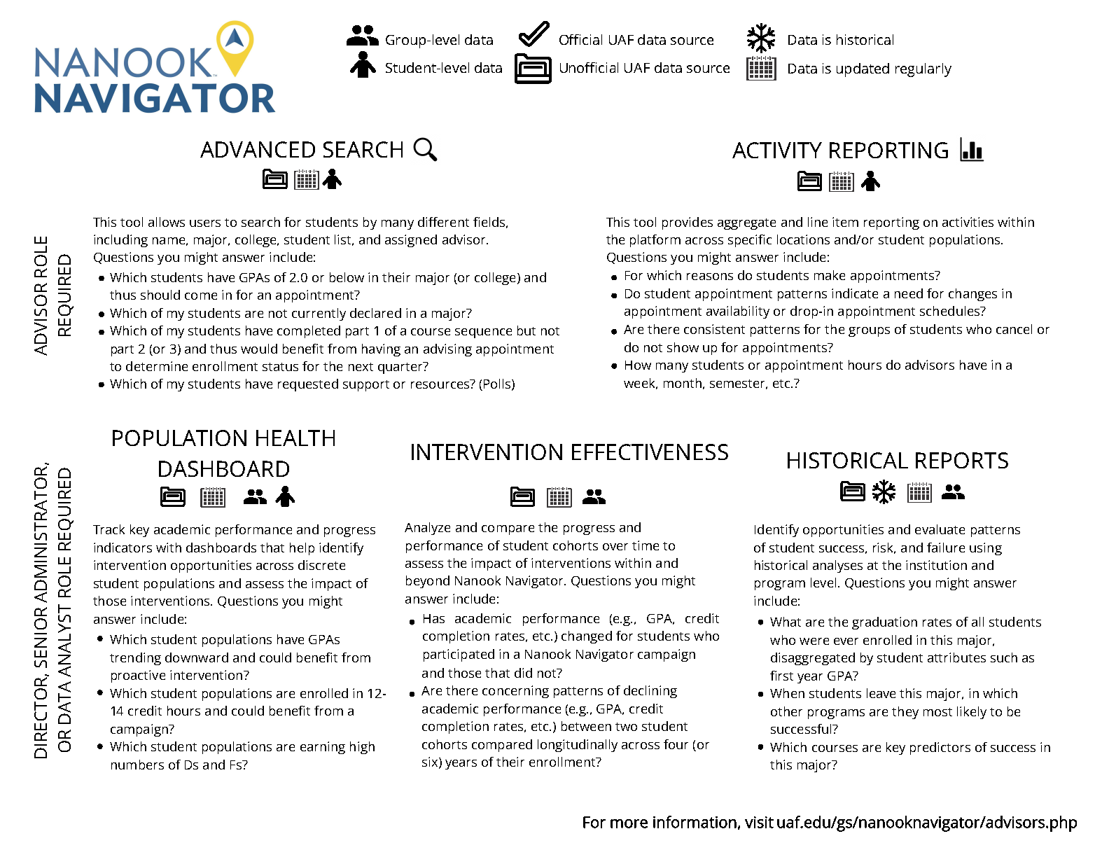 This key provides a list of the Nanook Navigator categories which can be used in reports and advanced searching. The key also provides a list of student holds or status codes you may see when viewing a student profile.