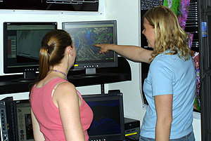 Tracking the Klyuchevskoy eruption locally are a handful students and faculty from the Geophysical Institute and the Alaska Volcano Observatory (GI/AVO) who process data used to reroute air traffic around dangerous volcanic ash clouds. Information is collected by satellite, Web cam, and Puff, a three-dimensional volcanic ash computer model. Once these data are synthesized, they are then shared at large to ensure the safety of thousands of people living in, or flying through the North Pacific.