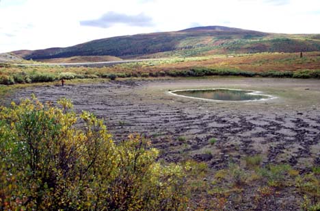 Sorted polygons and stripes formed in the basin of a seasonallydesiccated pond in the Tangle Lakes region of Alaska.