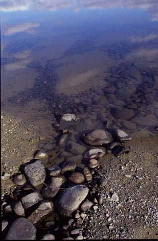 Sorted stripes grading into sorted polygonssubmerged in a seasonally desiccated pond in the Tangle Lakes region of Alaska.