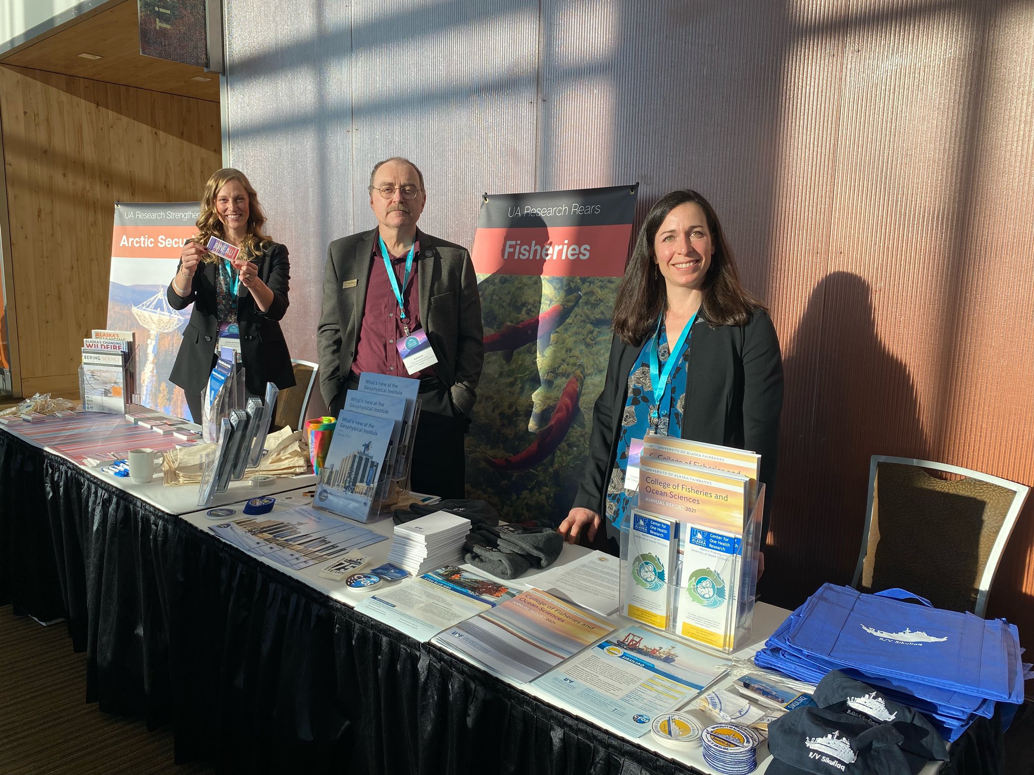 From the College of Fisheries and Ocean Sciences, Franz Mueter participated in a panel discussion about the future of fisheries management in the Arctic. Science communicator Alice Bailey represented CFOS and R/V Sikuliaq at the UA research table. Brian Barnes of the UAF Institute of Arctic Biology also attended.