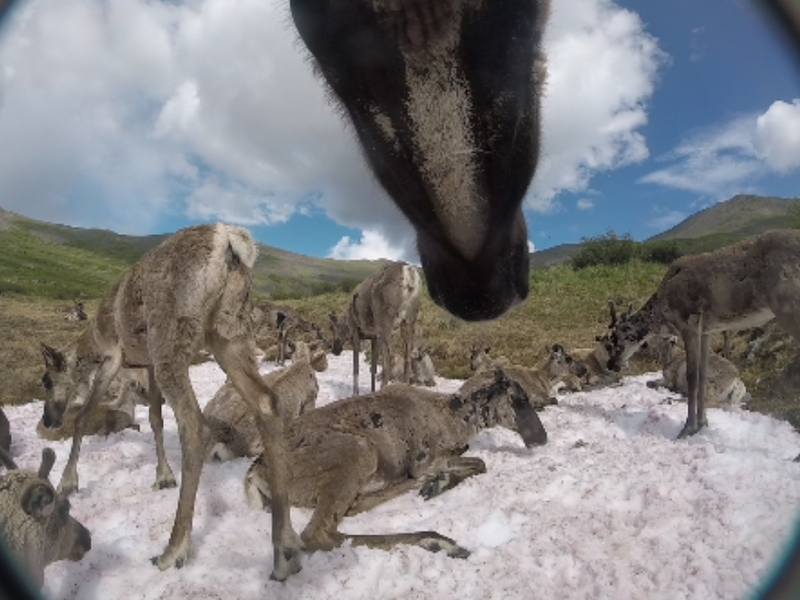 Caribou seek insect relief on a snowpatch in the Fortymile River country, as seen from a camera on a collar around the neck of a female caribou. This still image is from a nine-second video captured during a study of the herd using cameras that dropped to the ground in autumn.