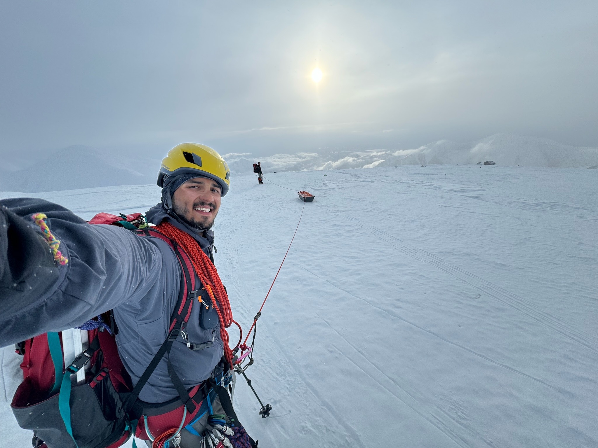 Roger Jaramillo walks on crampons while roped to a sled and his partner Matthew Crisafi-Lurtsema. The pair climbed Denali and sampled microplastics along their route in June 2024.