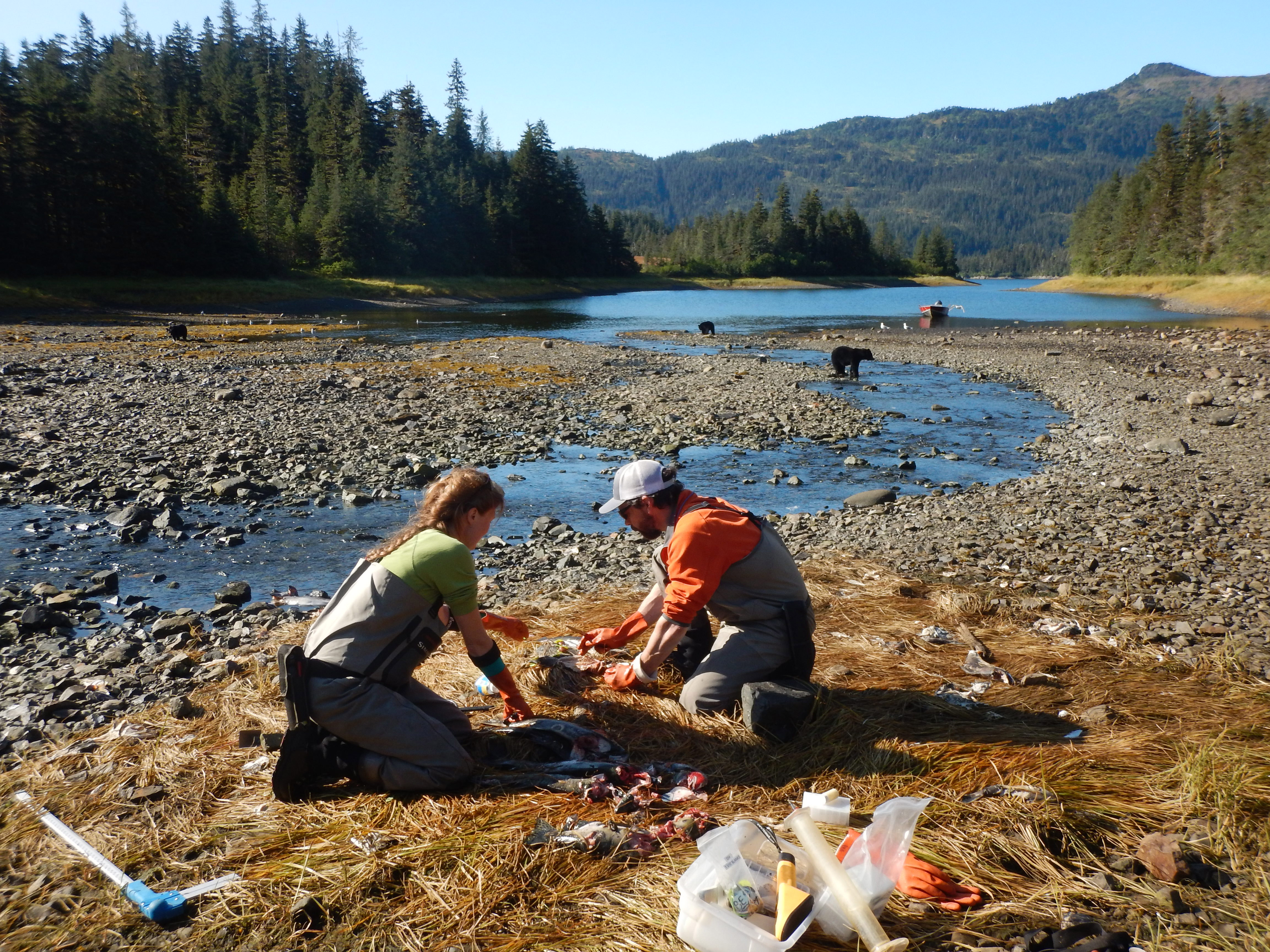 Researchers Julia McMahon, left, and Pete Rand measure and take tissue samples from pink salmon carcasses in Paddy Creek where it flows into Prince William Sound, Alaska, as black bears hunt in the background.