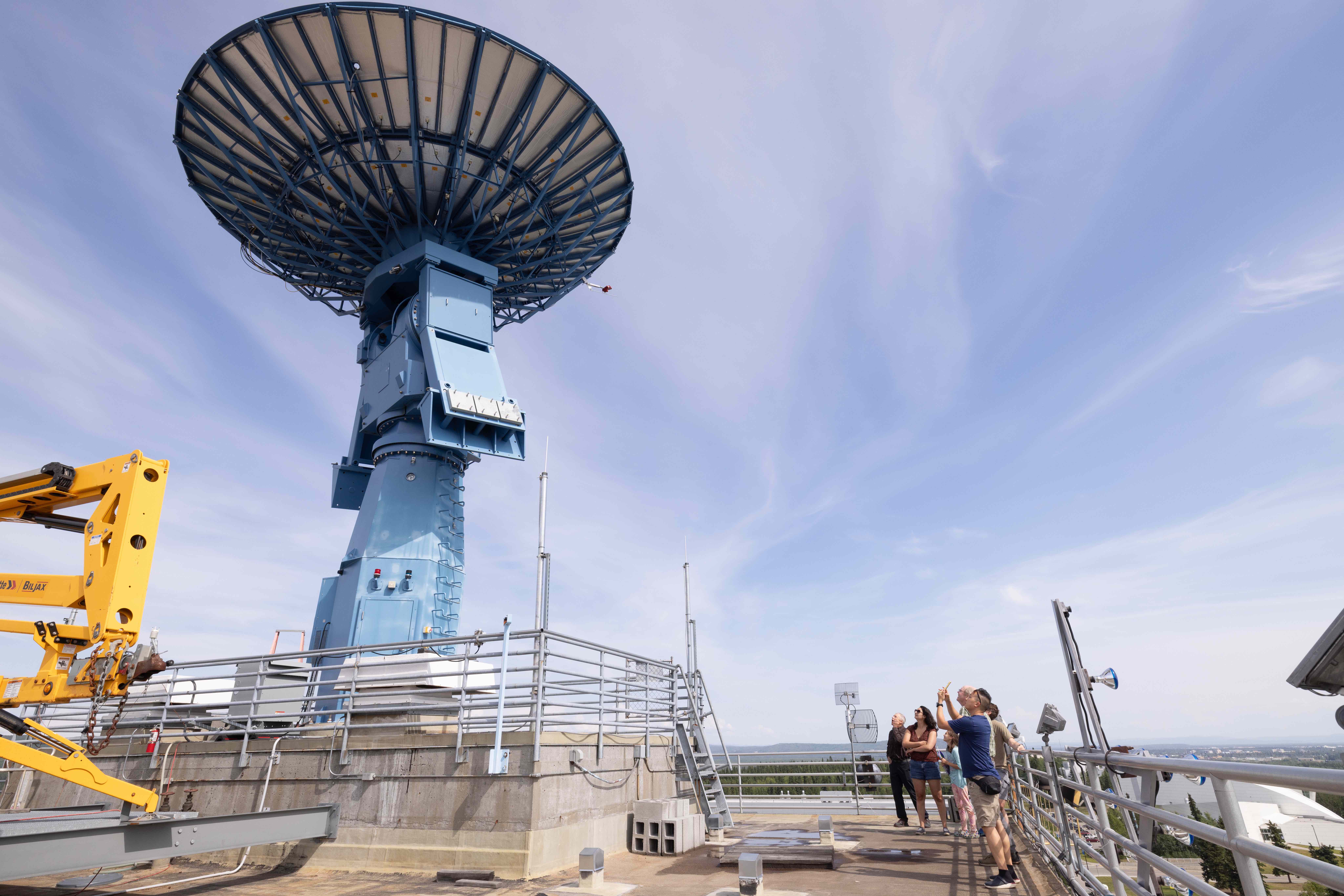 Visitors on a tour view the iconic blue satellite dish on the roof of the Elvey Building, home of the Geophysical Institute.