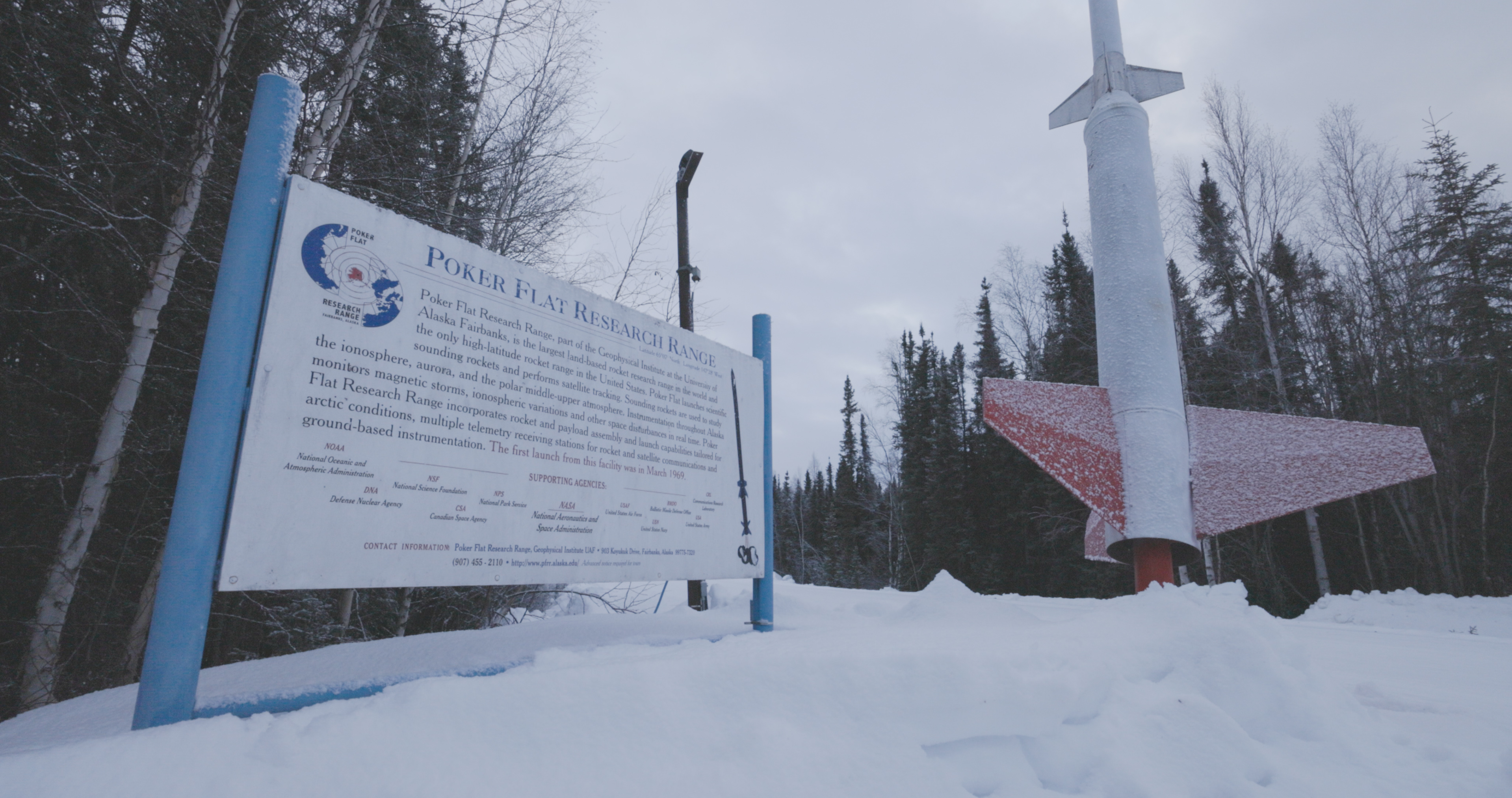 A sign along the Steese Highway marks the entrance to the Poker Flat Research Range, which the University of Alaska Fairbanks Geophysical Institute owns and operates under a contract with NASA.