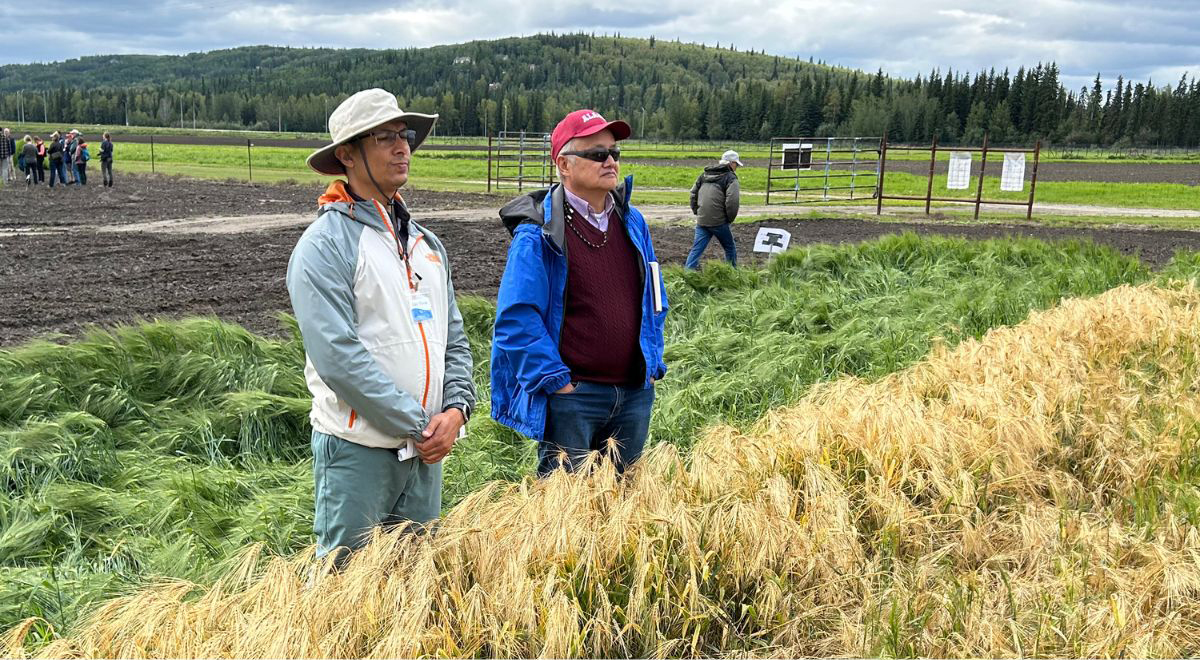 Jakir Hasan, left, stands with Mingchu Zhang, professor emeritus of agronomy and soil sciences with UAF’s Institute of Agriculture, Natural Resources and Extension, in a field of semi-dwarf barley on the Agricultural and Forestry Experiment Station on UAF’s Fairbanks campus.