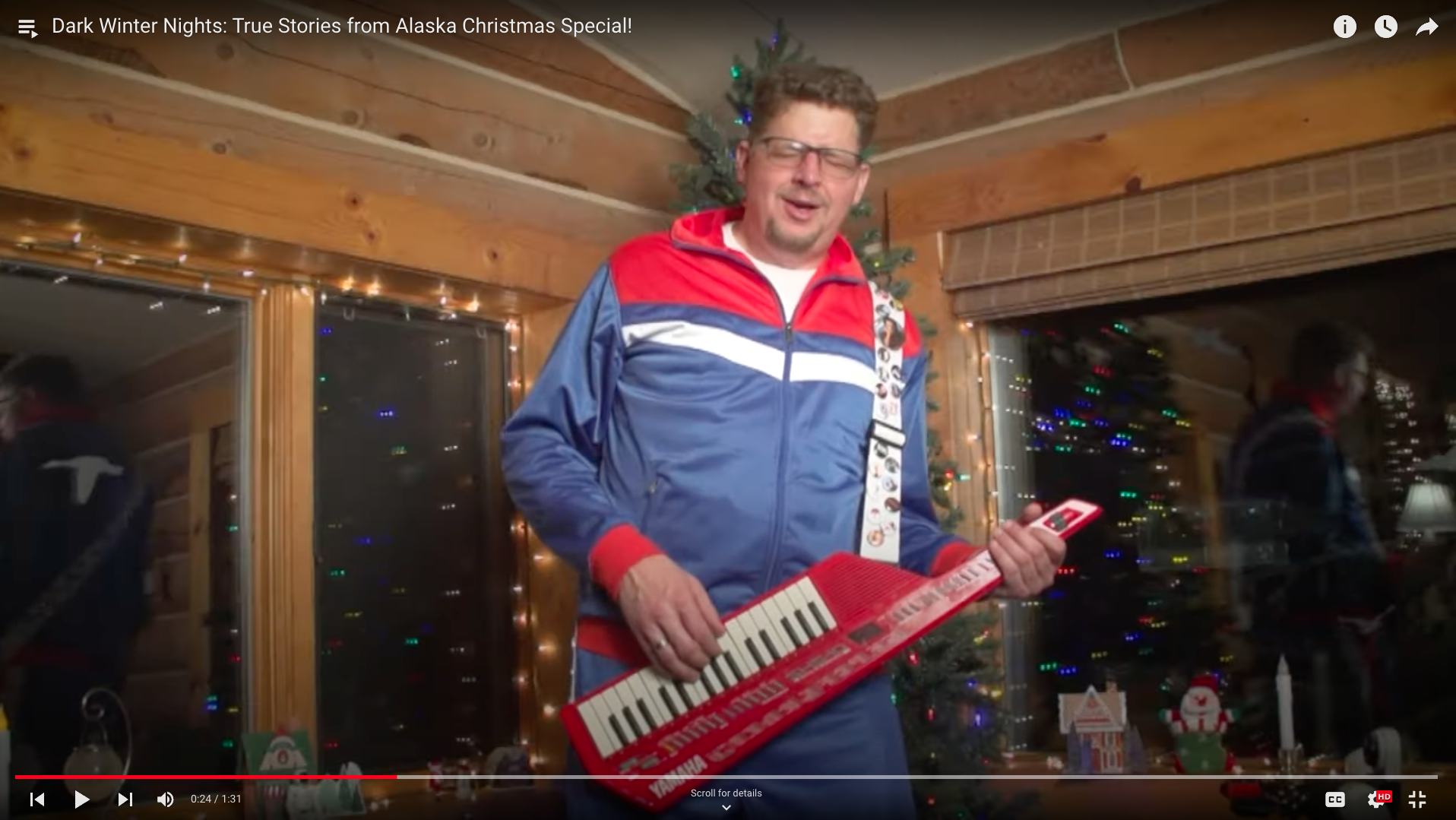 Rob Prince, UAF communication and journalism professor and "Dark Winter Nights" creator/host, plays the keytar while hosting a Christmas party at his home for the "Dark Winter Nights: True Stories from Alaska" Christmas Special.