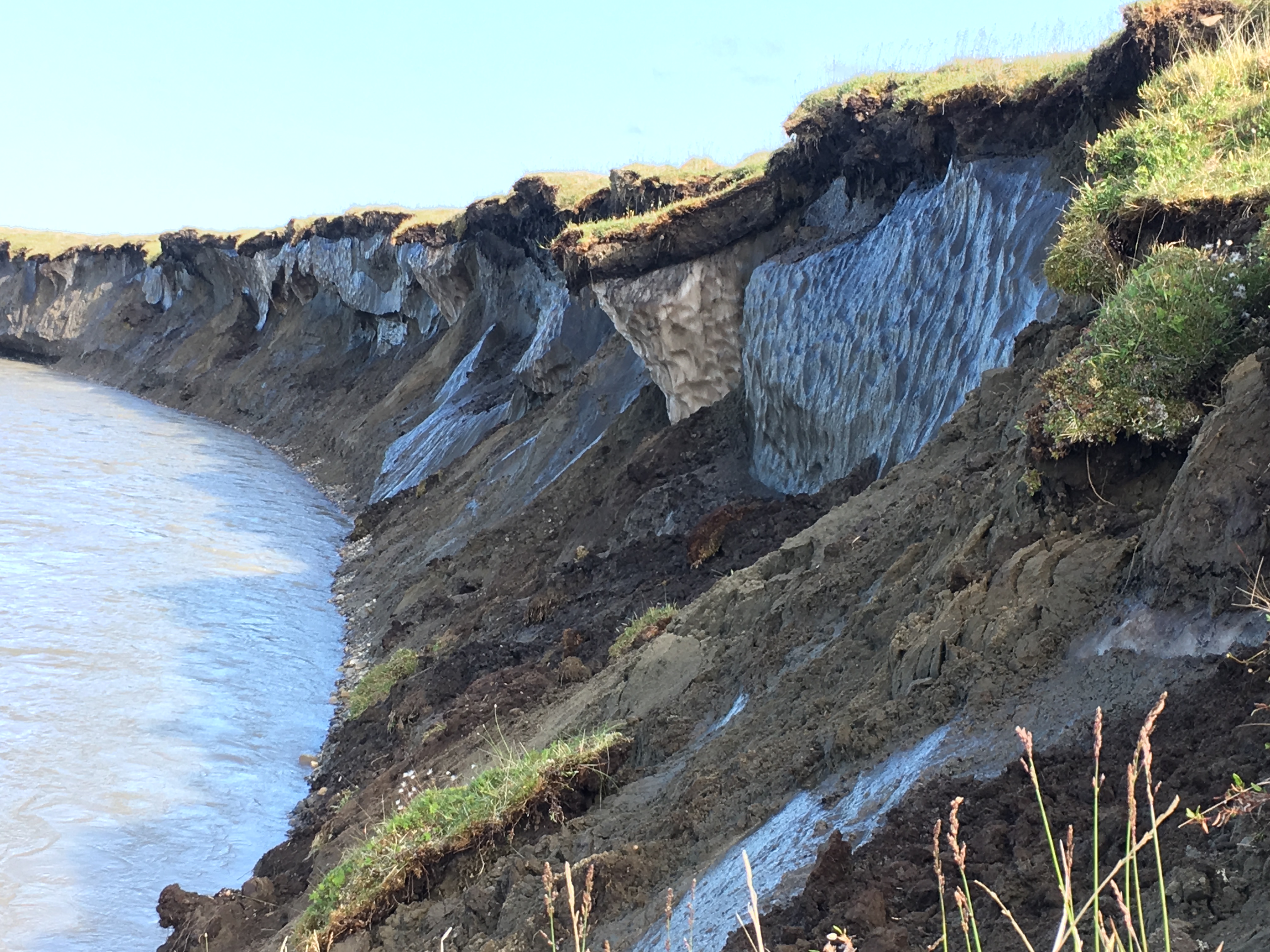 Permafrost stores large amounts of carbon that may be released to ecosystems and the atmosphere when permafrost thaws. These bluffs are on the bank of Alaska’s Canning River in 2019.