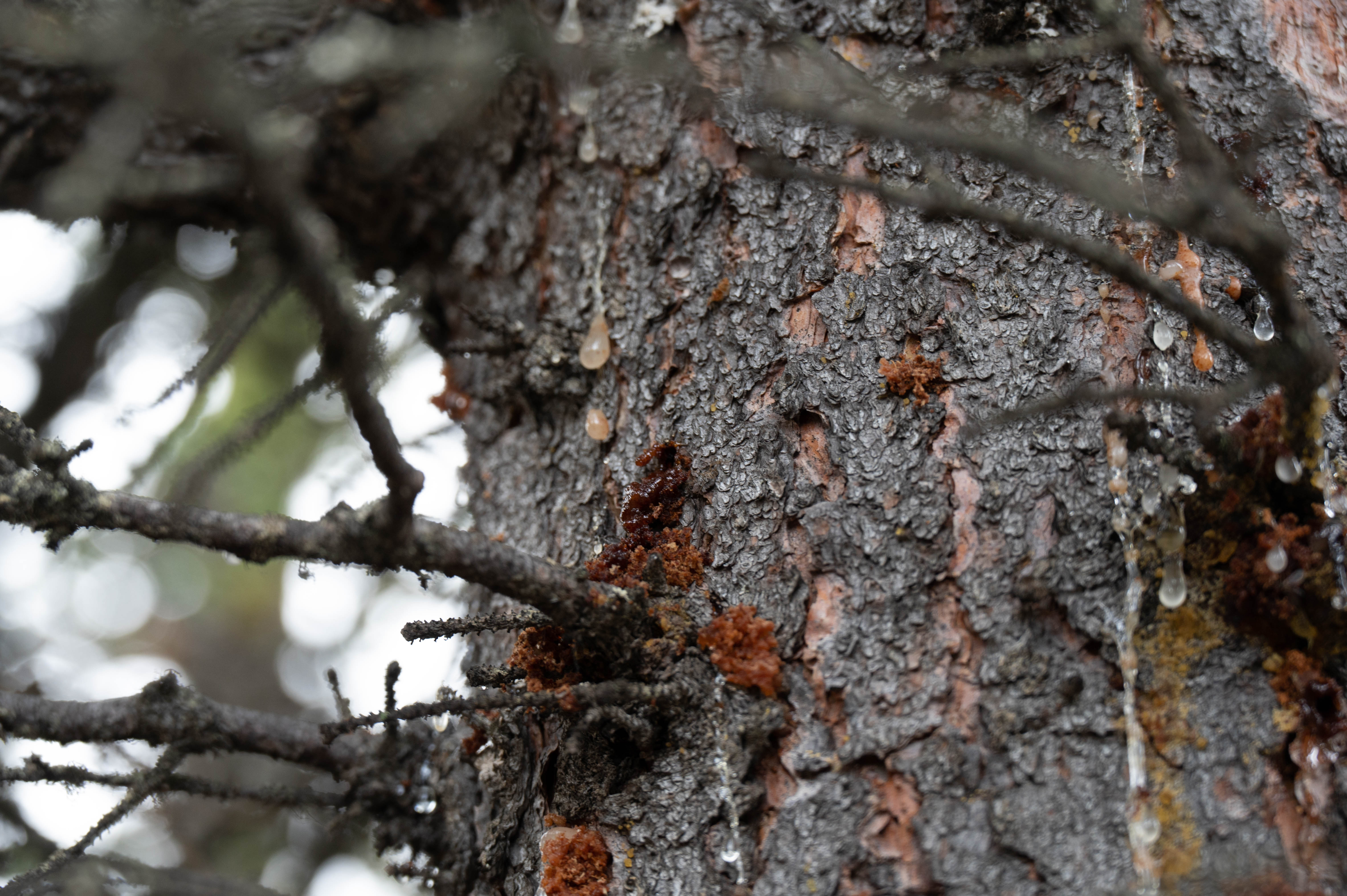 A heavy beetle infestation in this spruce tree is revealed by holes in the bark and orange and brown clumps of boring dust.