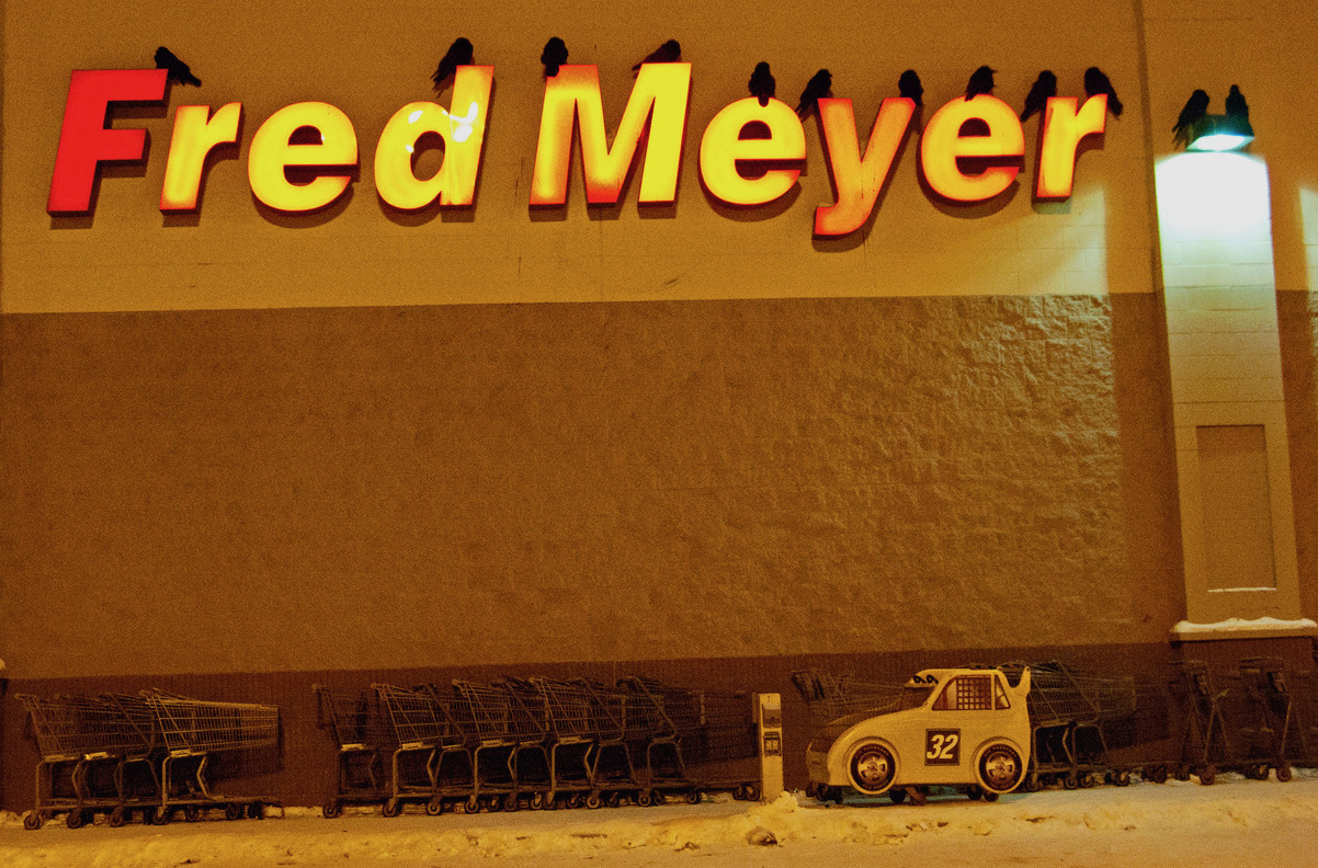 Ravens roost for the night on the letters of a grocery store in Fairbanks.